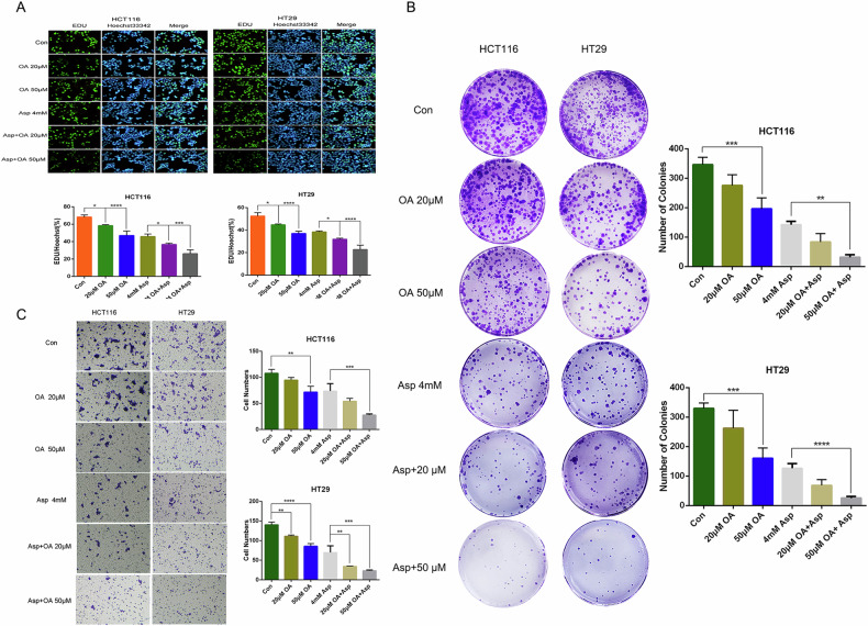 EdU实验显示,OA和阿司匹林联合使用显著降低细胞增殖比例(P<0.05)。集落形成实验和侵袭实验进一步证实了OA能够抑制CRC细胞的增殖和侵袭能力,并与阿司匹林联合使用时具有协同增强效果(图4A-C)。