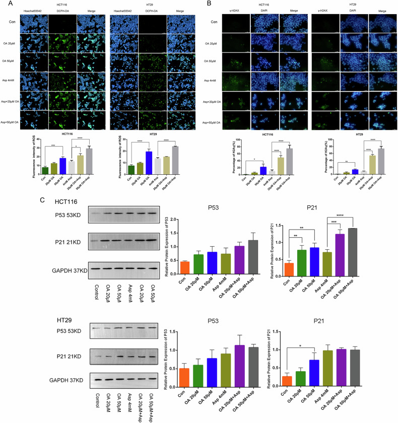 DCFDA探针和免疫荧光实验显示,OA和阿司匹林处理后,结直肠癌细胞内的ROS水平和DNA损伤标志物γH2A.X的表达显著增加,表明两者通过诱导ROS产生和氧化DNA损伤协同促进细胞损伤和死亡(图6A-B)。