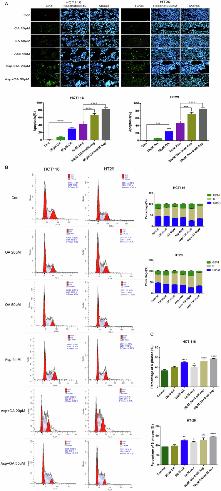 TUNEL实验显示,OA和阿司匹林处理后,HCT116和HT29细胞的凋亡率显著增加(P<0.001),表明两者联合使用能够显著诱导细胞凋亡(图5a)。流式细胞术检测结果显示,OA和阿司匹林处理后,HCT116和HT29细胞的S期细胞比例增加,表明两者能够诱导S期阻滞(图5B-C)。