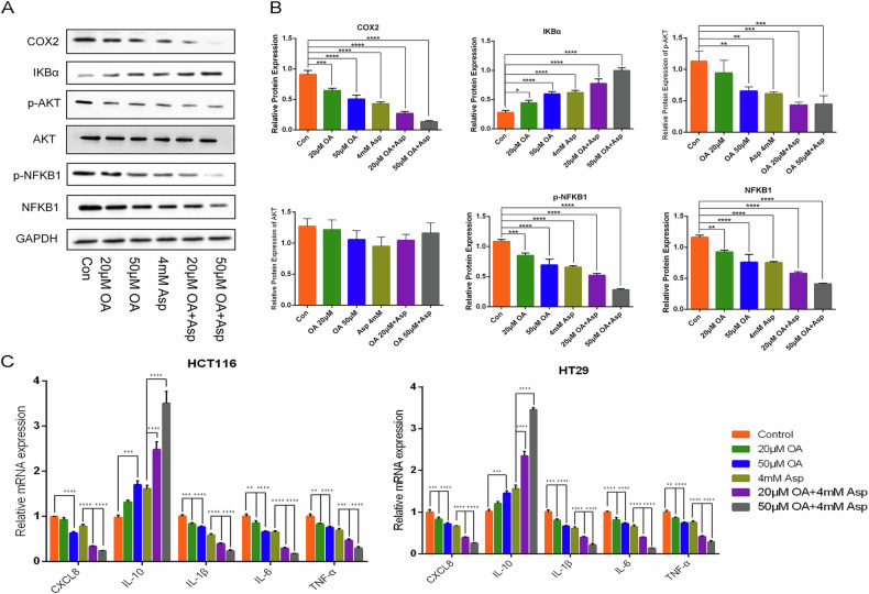 Westernblotting结果显示,OA、阿司匹林及其联合应用降低了AKT和NFκB1的磷酸化水平,并下调了COX2蛋白的表达,表明其可能通过抑制PI3K/Akt信号通路和NF-κB信号通路的激活来抑制癌细胞的增殖和存活(图7A-B)。RT-qPCR结果显示,OA、阿司匹林及其联合应用上调了IL10的表达,下调了IL6、TNF-α、IL1B和CXCL8的mRNA转录水平(图7C)。