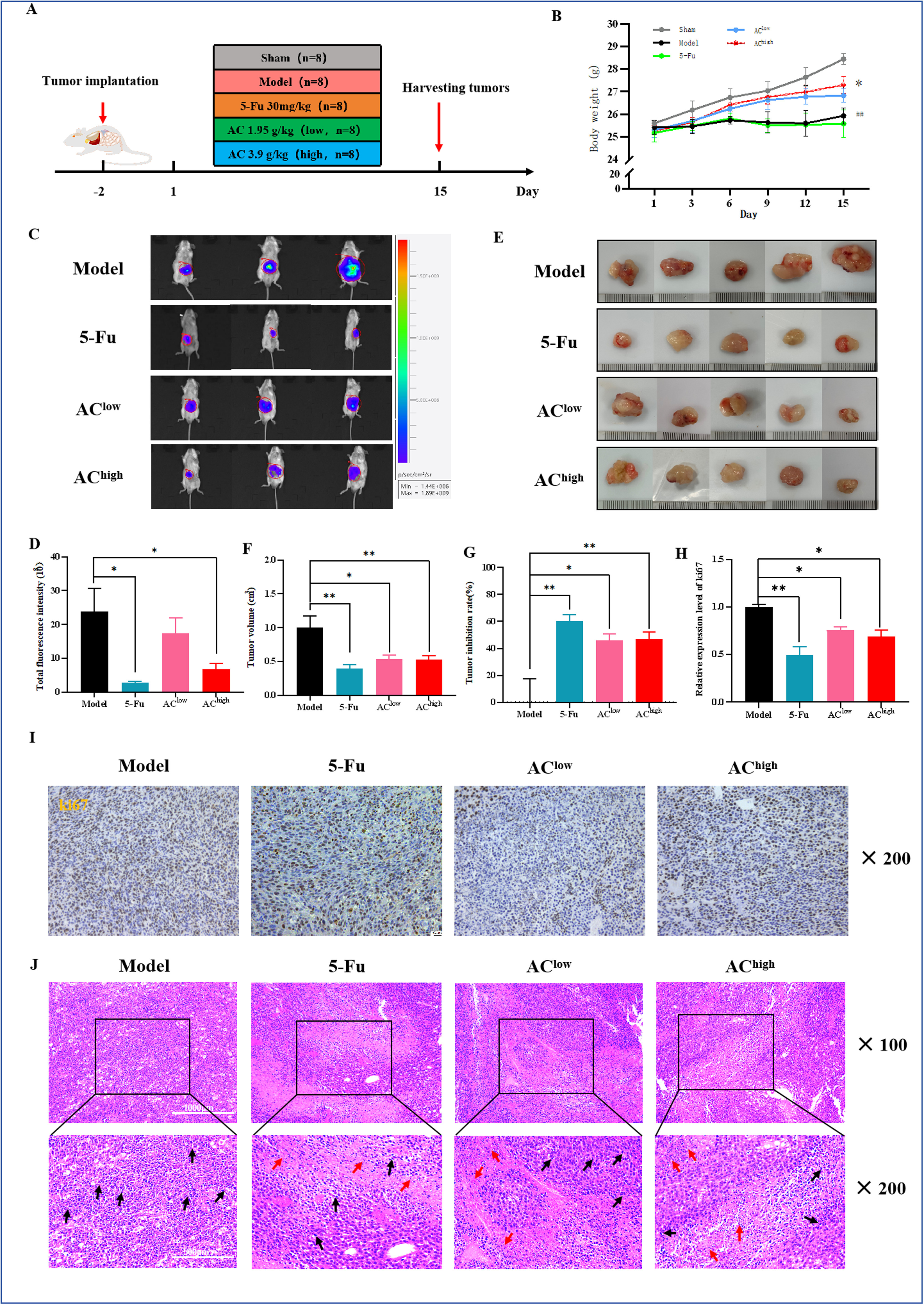 与模型组(Model)相比,5-Fu组和高剂量AC组(AC-high)的相对生物发光强度显著降低(图2C,D),表明5-Fu和AC-high能有效抑制肿瘤生长。肿瘤体积(图2E-G)和Ki67染色结果进一步支持了这一结论,显示药物干预组的肿瘤增殖率显著降低(图2H,I)。H&E染色显示,模型组的肿瘤组织细胞核密集,而药物干预组的肿瘤细胞分布显示出坏死区域,部分细胞核缺失(图2J)。