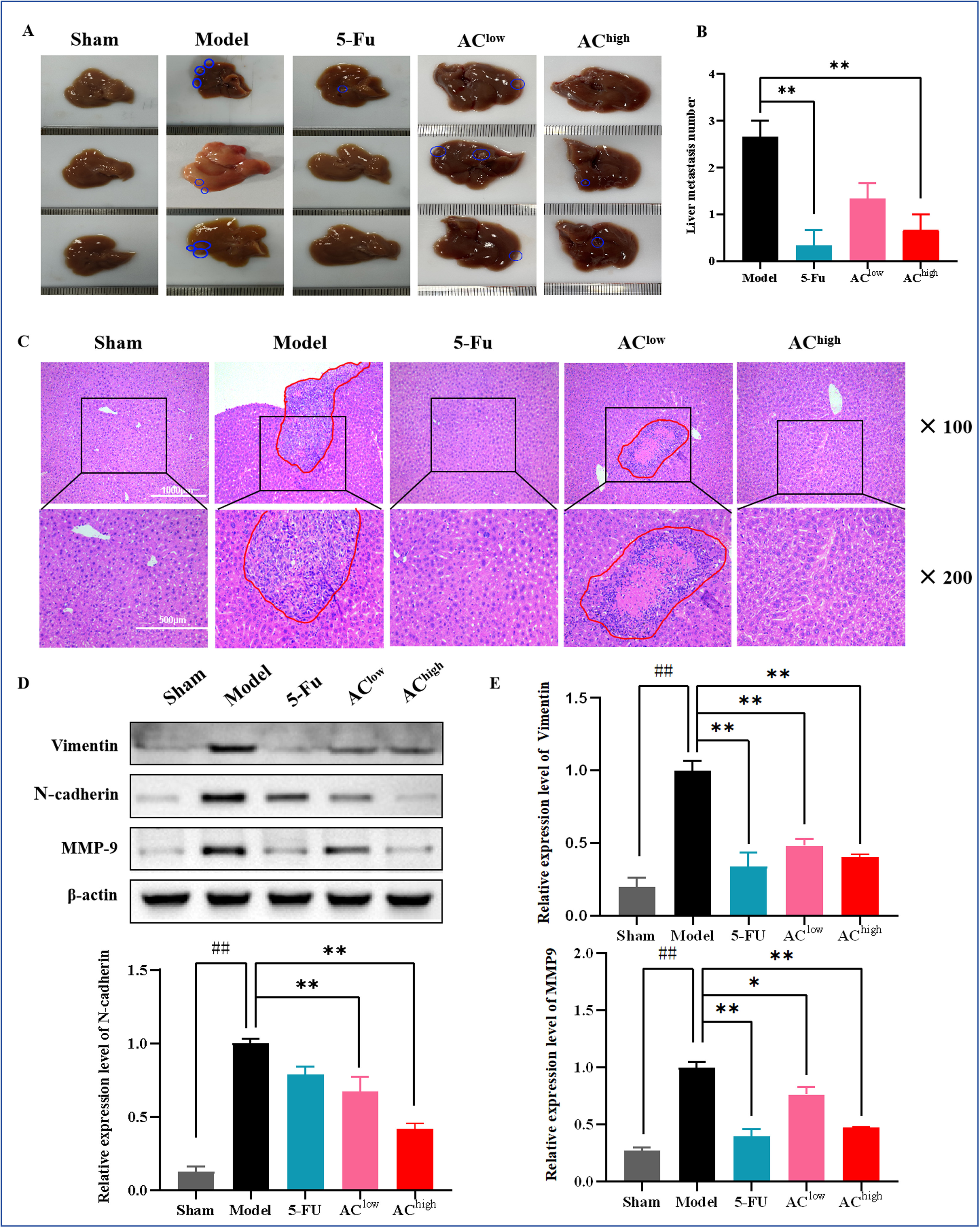 解剖后观察到肝脏上的白色结节,手动计数确定肝转移的数量。结果显示,模型组小鼠的肝脏显示出明显的转移迹象,而5-Fu和AC-high治疗后,肝转移结节的数量显著减少(图3A,B)。H&E染色进一步证实了转移灶核染色的变化(图3C)。WB分析显示,与假手术组相比,模型组中MMP9、N-cadherin和vimentin的表达水平显著升高,而AC给药后这些蛋白的表达水平降低(图3D,E)。