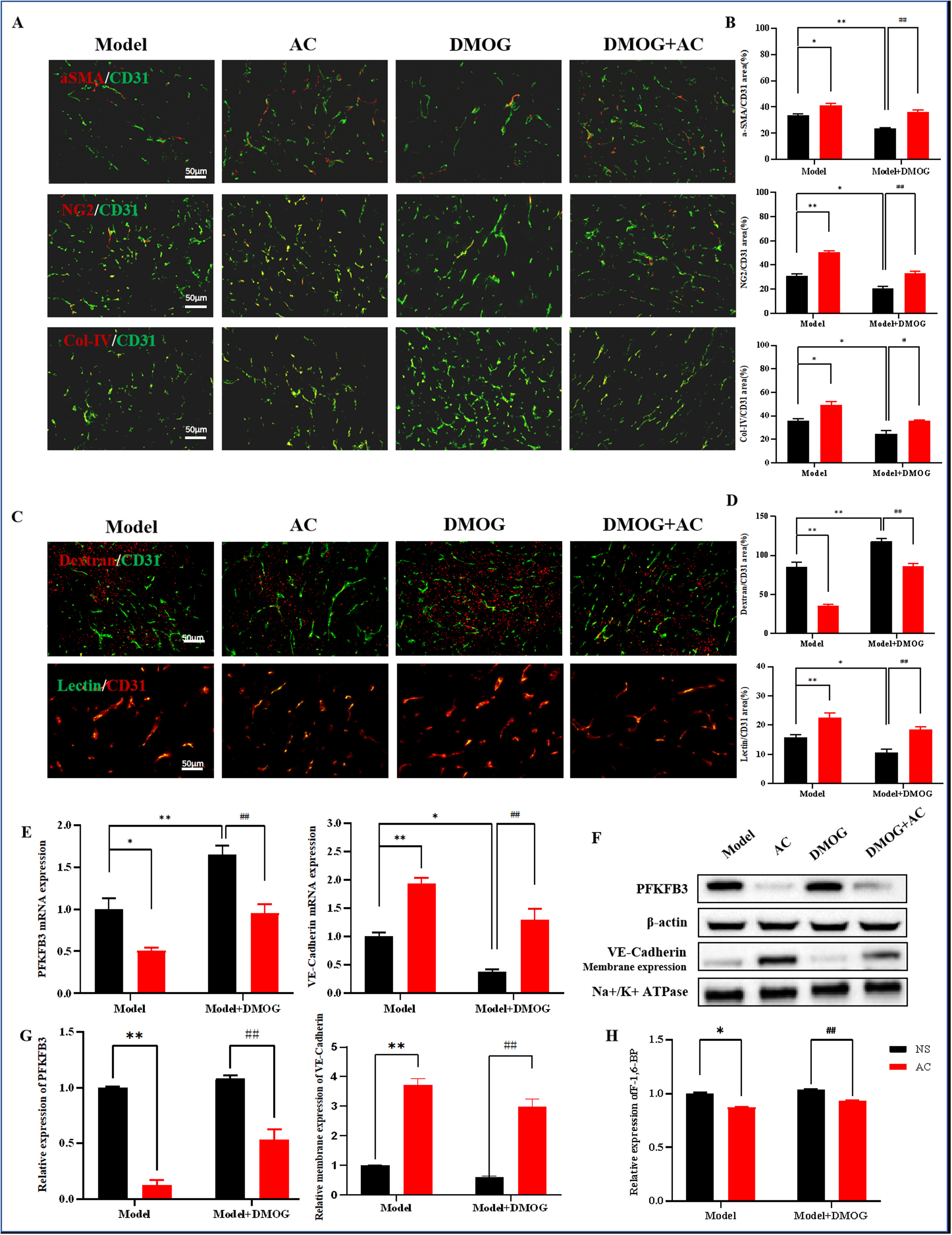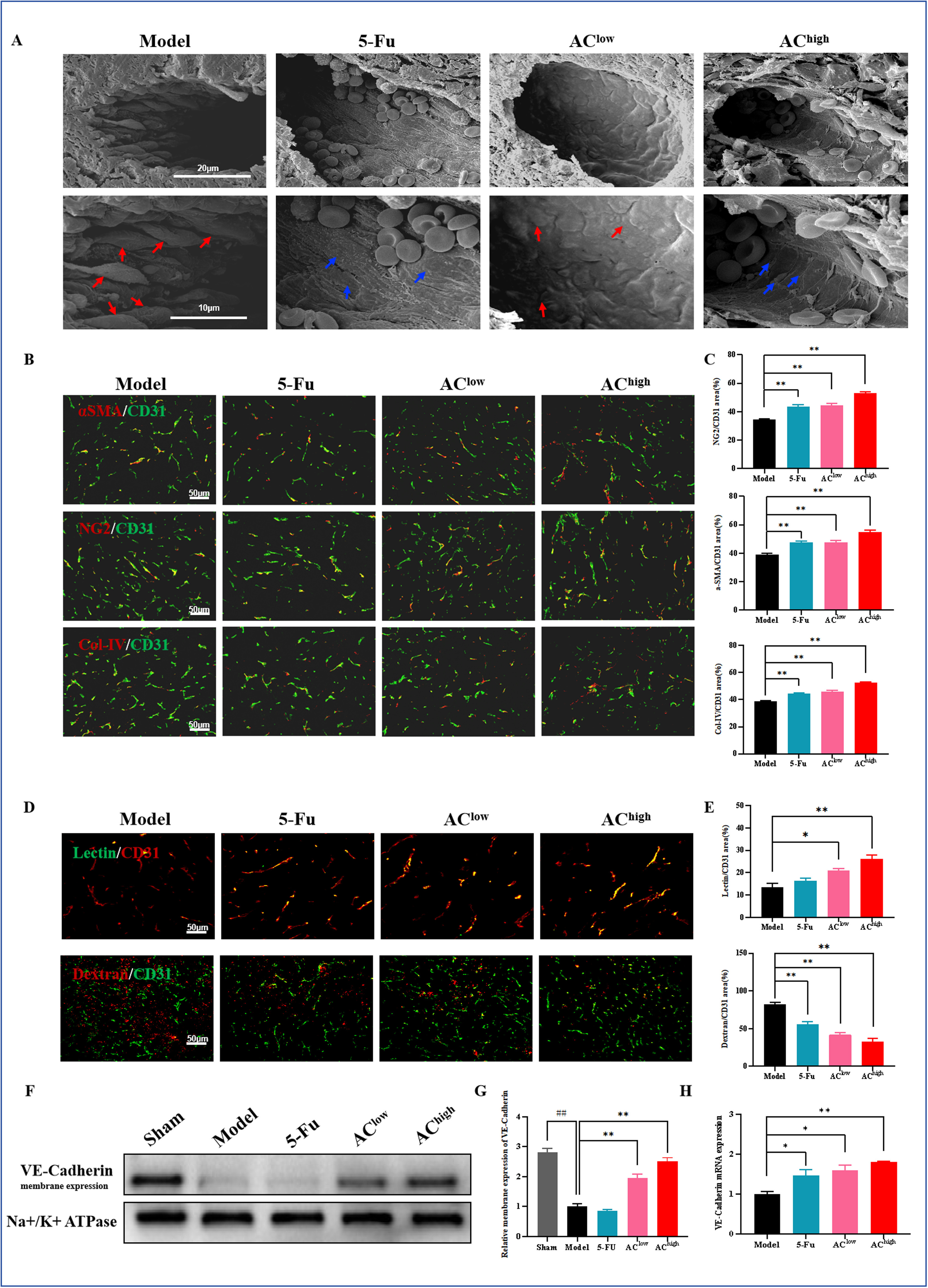 扫描电子显微镜观察结果显示,药物干预后,肿瘤相关内皮细胞(TECs)之间的连接紧密,细胞间间隙减小,形态趋于扁平(图4A)。α-SMA和NG2染色结果表明,AC干预后,血管平滑肌细胞和周细胞的覆盖显著增加。此外,IV型胶原蛋白(Col-IV)的覆盖也显著增强,表明基底膜的支持改善(图4B,C)。如预期,AC干预组中肿瘤血管的lectin阳性染色面积显著增加(图4D,E),且AC干预显著减少了周围血管的dextran渗漏,表明血管通透性降低(图4D,E)。VE-cad在增强内皮细胞连接中起关键作用,qRT-PCR分析显示AC干预后VE-cad表达增加。WB分析进一步评估了VE-cad在细胞膜上的分布,结果显示,与假手术组相比,模型组中细胞膜上的VE-cad表达水平显著降低,而AC给药后VE-cad表达水平相对升高(图4F-H)。