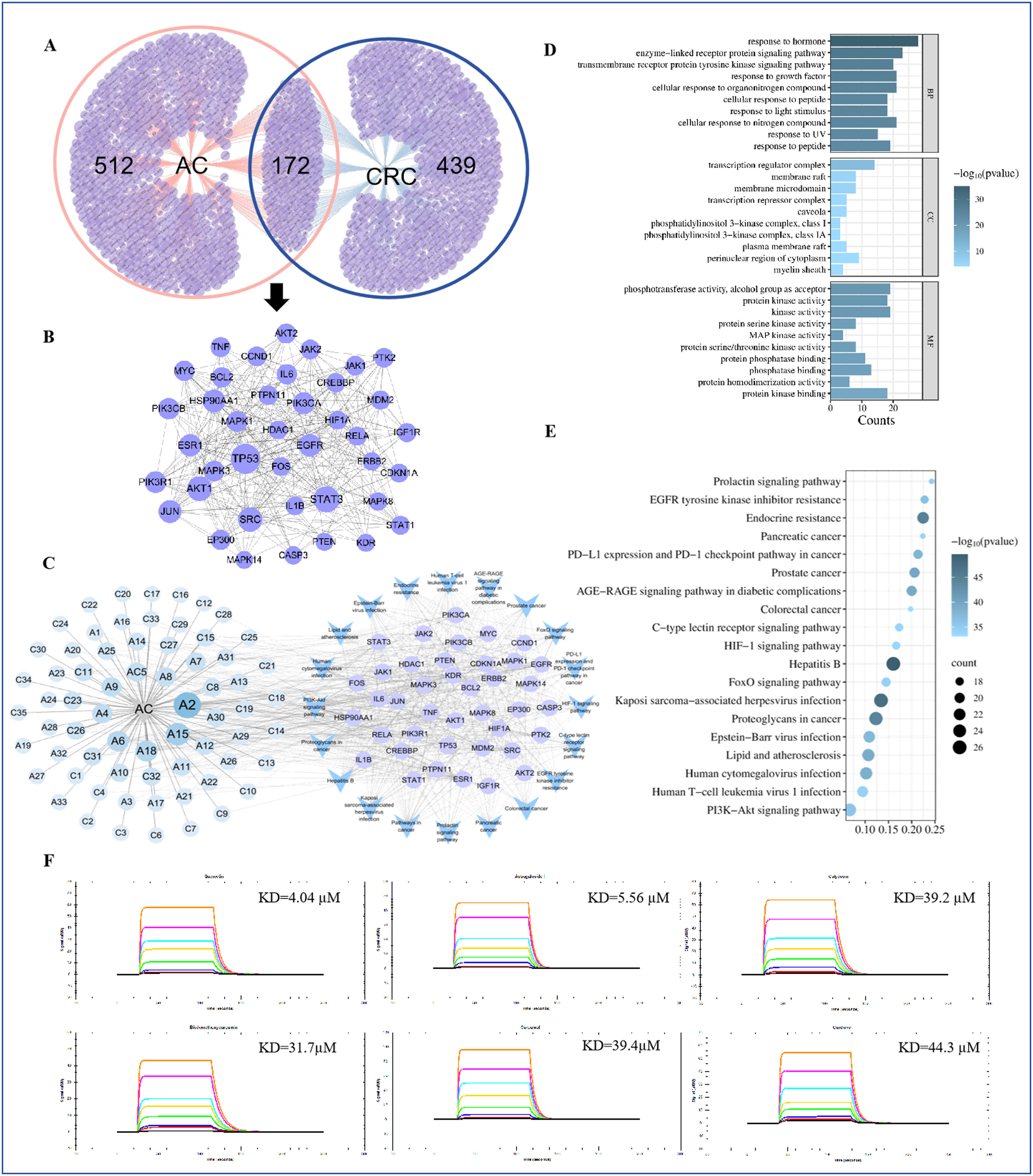 网络药理学分析表明,AC可能通过改善缺氧微环境来促进肿瘤血管正常化。通过RNA测序数据,研究了AC干预是否能通过改善缺氧微环境来促进肿瘤血管正常化。共鉴定出611个与结直肠癌(CRC)相关的靶点和684个与AC相关的靶点。通过在线工具Venny2.1.0,确定了172个与AC相关的抗CRC靶点(图5a)。这些蛋白的相互作用(PPI)从STRING数据库获得,并在Cytoscape3.7.2中构建了PPI网络(图5B)。基于“degree”值选择了前40个关键靶点,进一步进行KEGG富集分析和“成分-靶点-通路”网络的构建(图5C)。KEGG分析显示,主要信号通路包括PI3K-Akt、FoxO和HIF-1(图5D,E)。基于这些发现,我们重点关注HIF-1α,这是该信号通路的核心靶点。成分-靶点-通路网络表明,AC的主要成分通过这些关键靶点和通路发挥作用,包括槲皮素(A2)和山柰酚(A15)(图5C)。