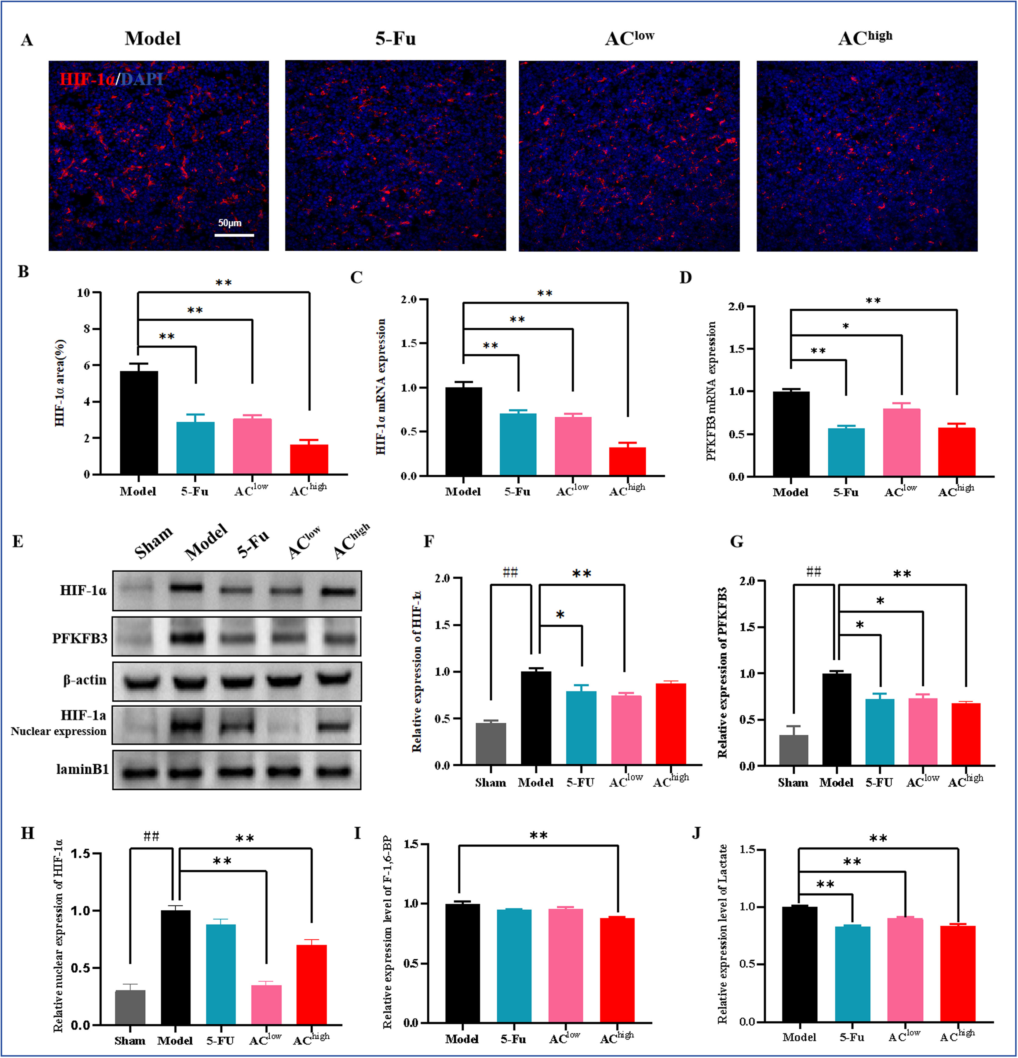 HIF-1α仅在缺氧条件下稳定表达,允许其转位到细胞核并调节多种基因的转录。首先,我们对肿瘤组织中的HIF-1α进行IF染色,以评估各组肿瘤缺氧的程度。结果显示,药物干预减少了肿瘤组织中HIF-1α阳性区域的面积,改善了肿瘤的氧合(图6A,B)。qRT-PCR和WB分析进一步证实了这些发现(图6C,E,H)。进一步检查肿瘤组织中HIF-1α蛋白的核表达,结果显示,与假手术组相比,模型组中HIF-1α的表达水平显著升高,而AC给药后HIF-1α的核表达水平降低(图6C,E,H)。HIF-1α诱导多种代谢转化酶,使肿瘤代谢转向糖酵解。PFK-1是糖酵解的主要限速酶,由PFKFB产生的果糖-2,6-二磷酸激活,从而促进糖酵解。我们的结果显示,与假手术组相比,模型组中PFKFB3异常过表达,而药物干预后其表达水平显著下调(图6D,E,G)。我们测量了果糖-1,6-二磷酸水平,发现AC-high处理后该水平降低(图6H)。乳酸的产生是肿瘤细胞糖酵解率的主要指标。我们的研究发现,AC干预组的血清乳酸水平显著低于模型组(图6I)。