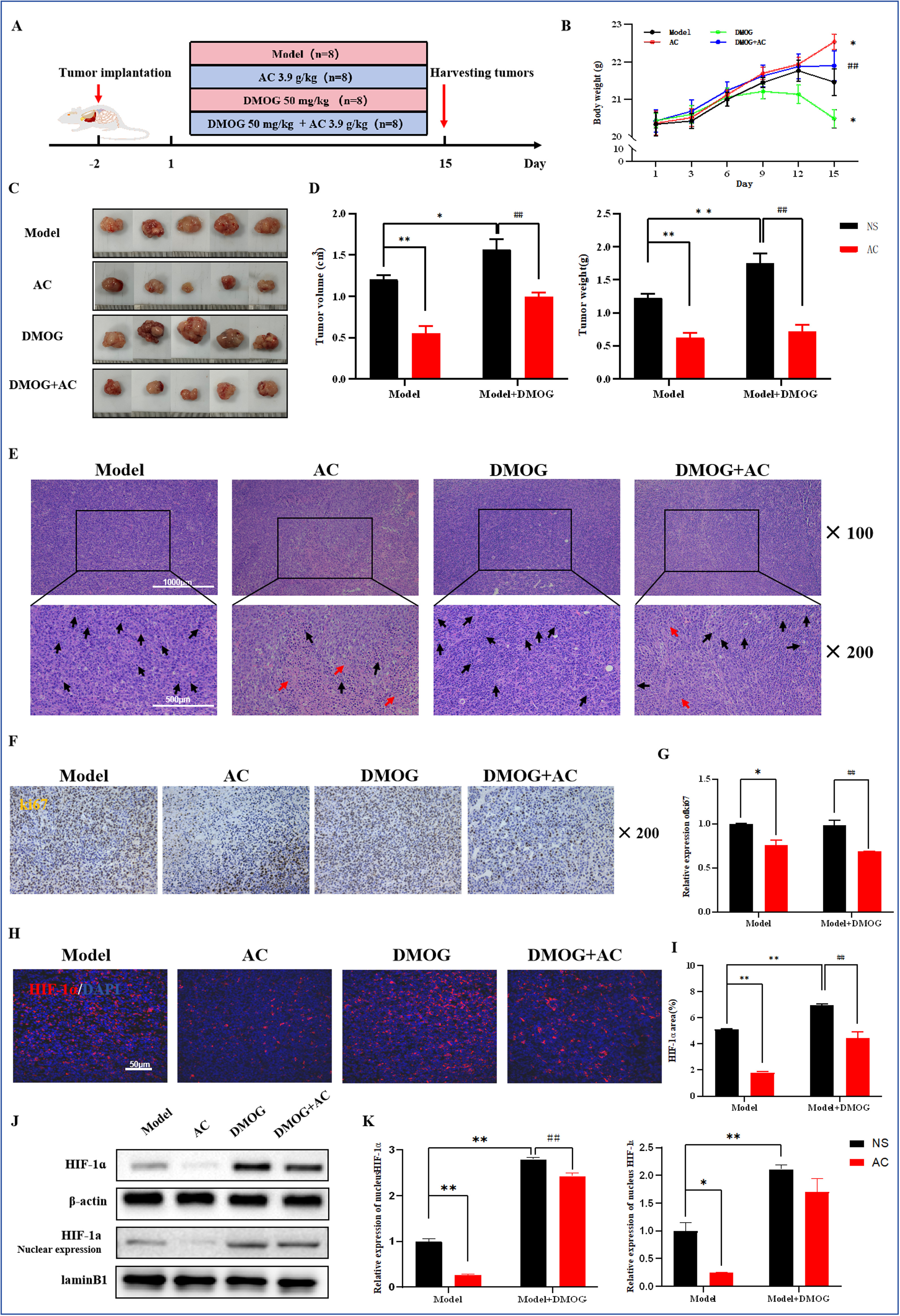 首先通过腹腔注射HIF-1α稳定剂DMOG来建立有效稳定和积累HIF-1α的小鼠模型。为了评估DMOG的效果,我们对各组小鼠肿瘤组织中的HIF-1α进行了IF染色。结果显示,与模型组相比,DMOG处理组中HIF-1α的阳性表达显著增加。此外,AC和DMOG联合干预后,HIF-1α的阳性率显著降低(图7H,I)。WB分析进一步证实了这些发现(图7J,K)。我们进一步研究了HIF-1α过表达对小鼠肿瘤生长和转移的影响,并比较了AC干预的效果。与模型组相比,DMOG刺激后肿瘤体积和重量增加。此外,在AC和DMOG联合组中,肿瘤体积和重量相较于DMOG单独组有所减少(图7C,D)。H&E染色显示,与DMOG单独组相比,AC和DMOG联合组的肿瘤细胞核排列稀疏,显示出明显的肿瘤坏死区域和细胞核缺失(图7E)。Ki67IHC染色的结果与这些发现一致(图7F,G)。