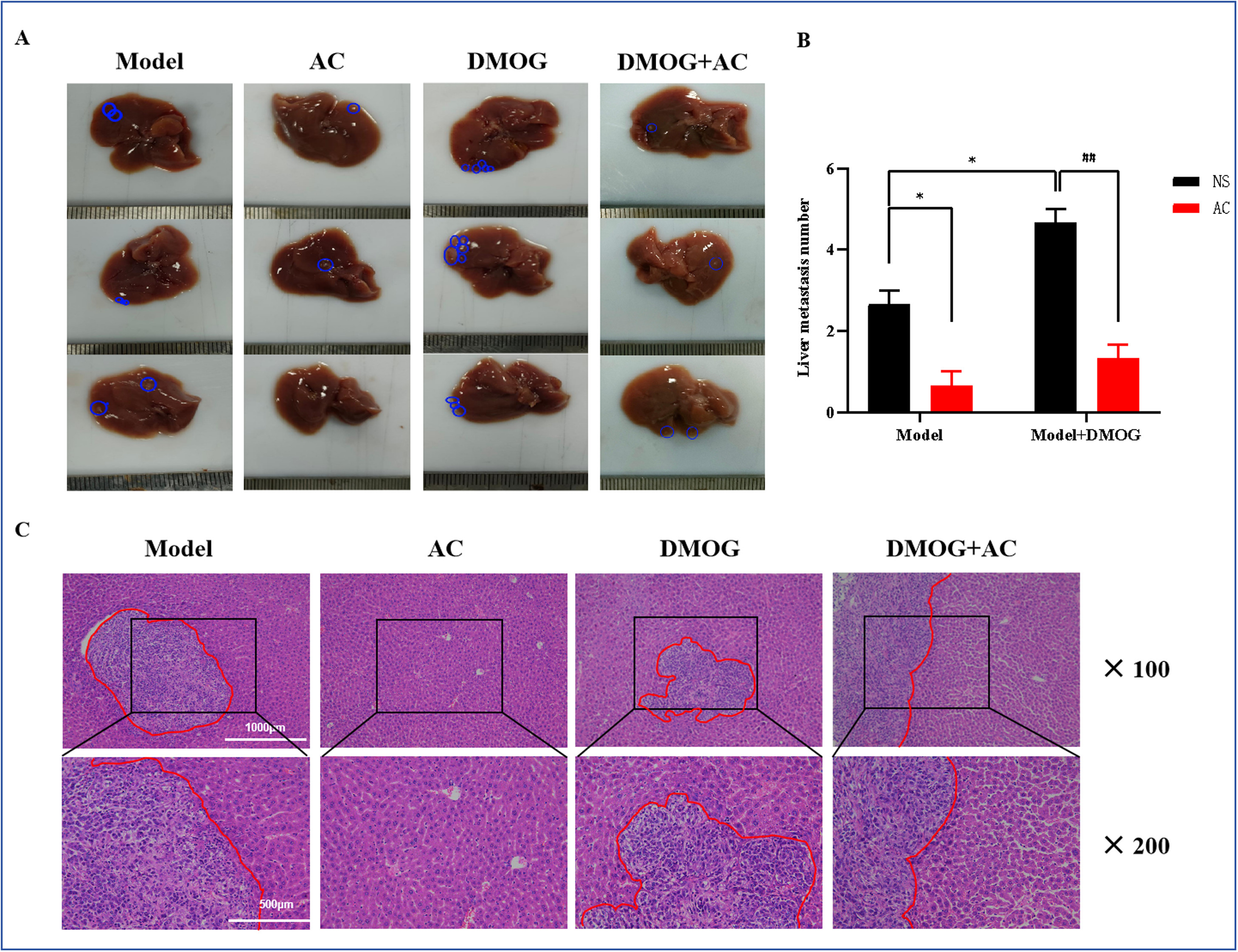 与模型组相比,DMOG刺激后的肿瘤显示出更强的肝转移能力,而AC治疗抑制了缺氧诱导的肝转移(图8A,B)。H&E染色证实了这些发现(图8C),表明DMOG处理后肿瘤的肝转移增加。相反,在AC和DMOG联合干预组中,肝转移相较于DMOG单独组有所减少。