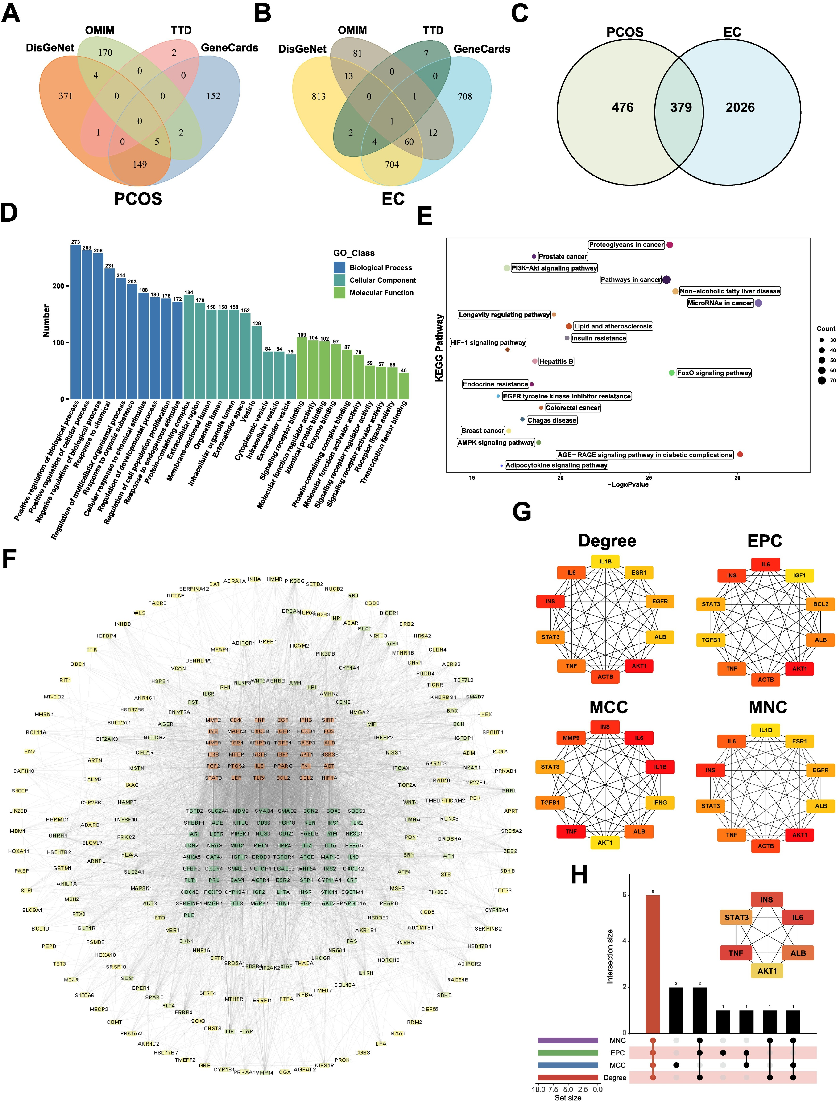 通过数据库鉴定了与PCOS和EC相关的潜在靶基因(图2A和B)。维恩图显示379个基因同时与PCOS和EC相关(图2C)。GO分析表明这些基因在生物过程(BP)、细胞成分(CC)和分子功能(MF)类别中富集。值得注意的是,最显著富集的BP术语是“对内源性刺激的反应”,CC类别中显著富集于“细胞外空间”,MF类别中显著富集于“信号受体结合”(图2D)。KEGG通路分析显示最显著的通路是“癌症中的microRNA”(图2E,表S5)。通过STRING数据库构建了共表达基因的PPI网络(图2F)。使用Cytoscape的CytoHubba插件中的Degree、EPC、MCC和MNC四种算法分析,确定了六个核心基因靶点:AKT1、ALB、IL6、INS、TNF和STAT3(图2G和H)。
