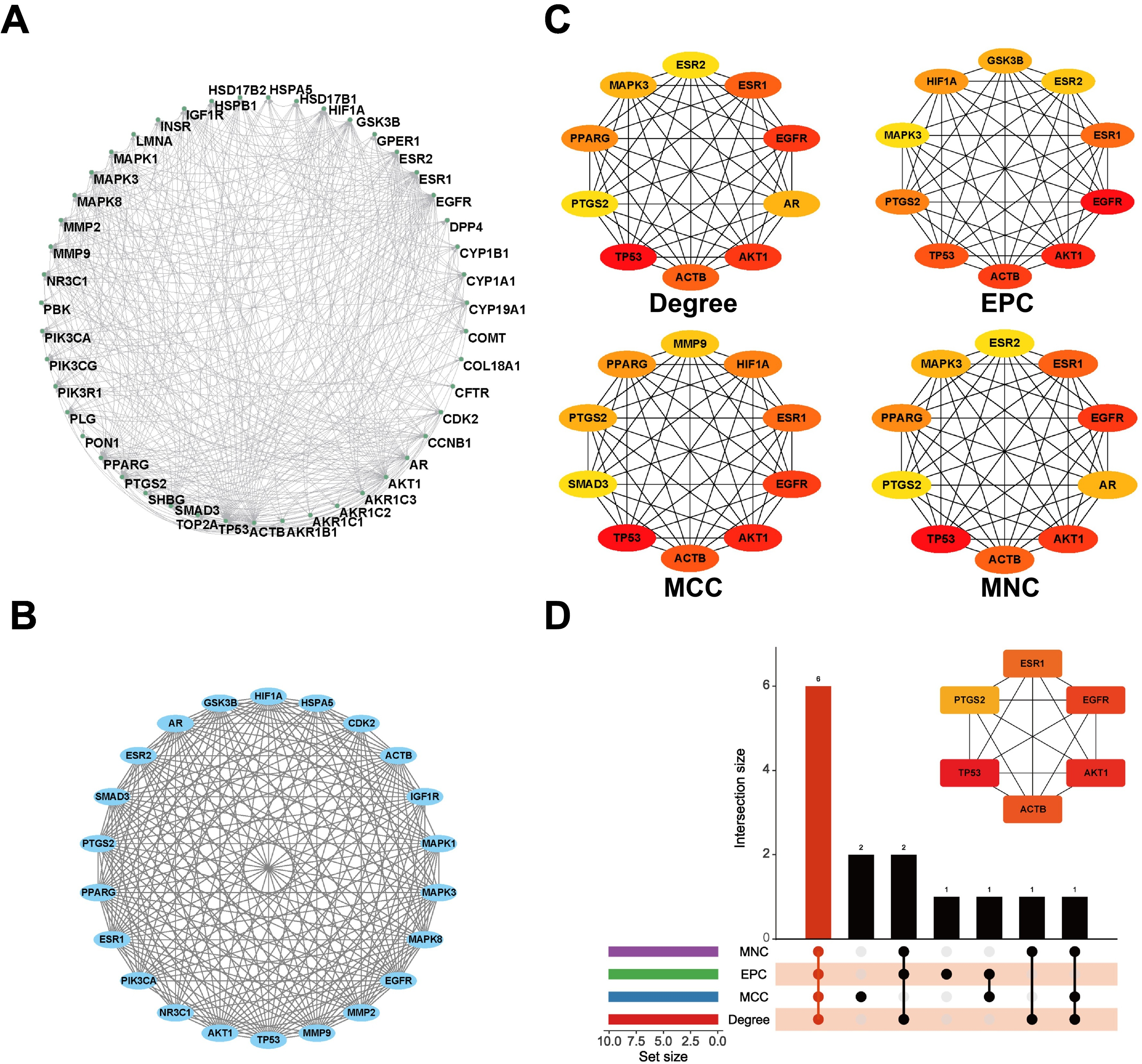 使用STRING数据库构建PPI网络并通过Cytoscape分析(图4A)。利用MCODE插件进行功能分析,鉴定出高度互联的基因簇,确定了前22个hub基因(图4B)。通过CytoHubba插件的Degree、EPC、MCC和MNC算法筛选出前10个hub基因(图4C)。UpSet图显示六个hub基因(ACTB、AKT1、ESR1、EGFR、PTGS2和TP53)被四种算法一致识别(图4D)。