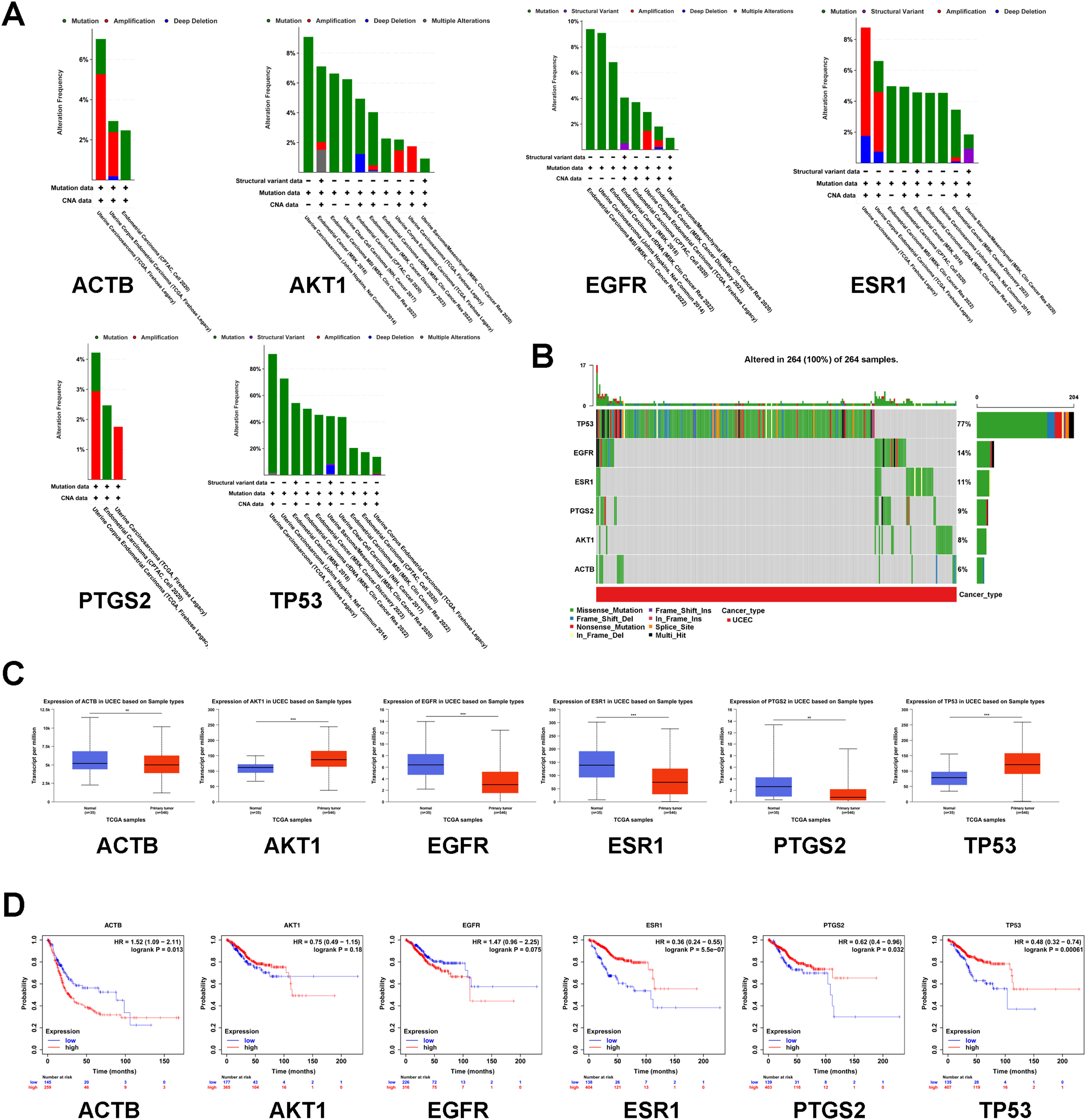 为评估EC相关hub基因的潜在遗传修饰,分析了DNA拷贝数变异(CNVs)和单核苷酸变异(SNVs)。遗传改变主要为突变和扩增(图5a和B)。通过UALCAN数据库评估关键hub基因在EC中的mRNA表达水平,结果显示AKT1和TP53在EC中表达升高,而ACTB、ESR1、EGFR和PTGS2表达降低(图5C)。生存分析表明,ESR1、PTGS2和TP53的高表达与EC患者总生存期改善相关,而ACTB高表达与不良预后相关(图5D)。