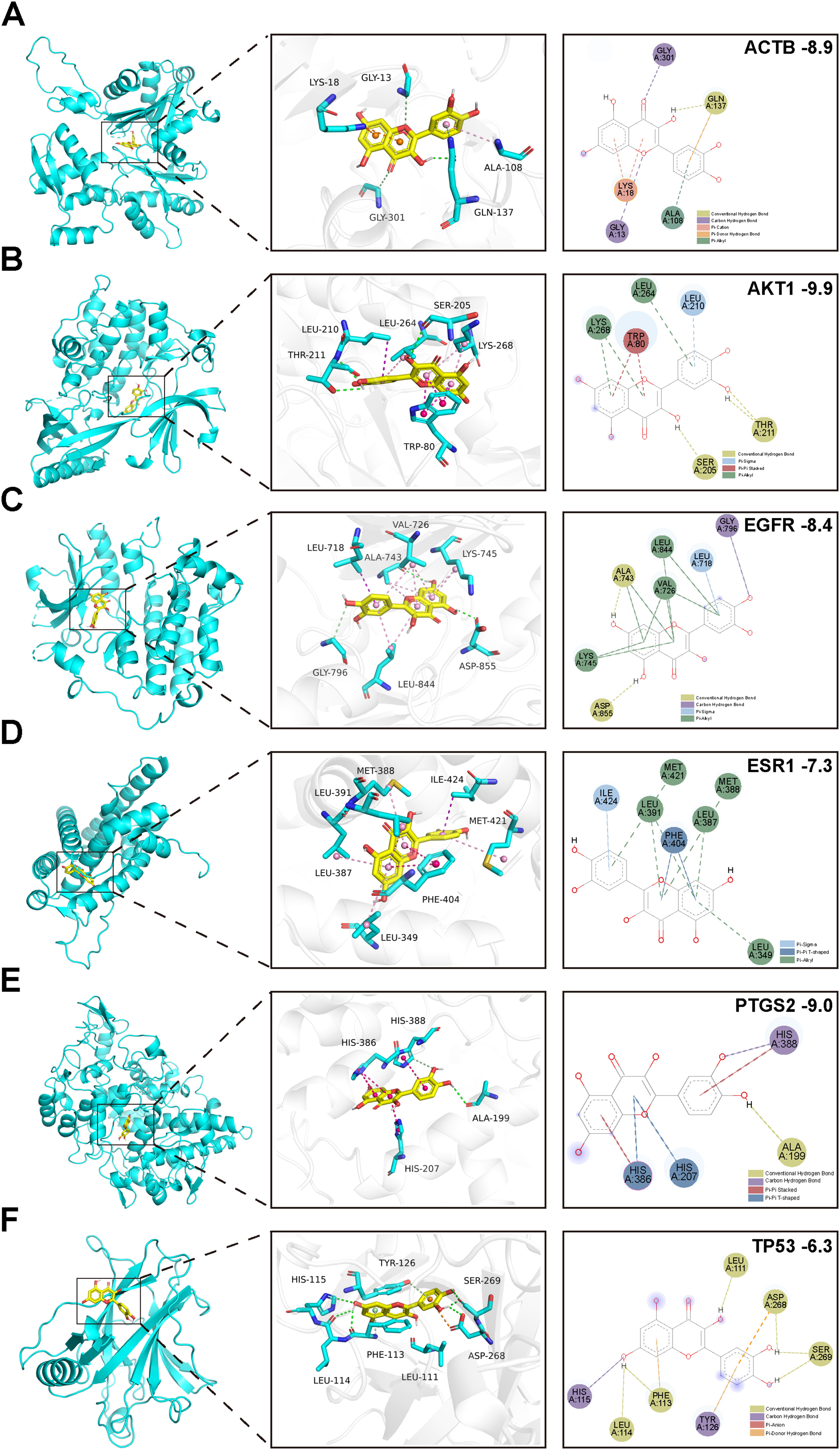 分子对接结果显示槲皮素与六个hub基因均有高亲和力结合,结合能分别为:ACTB-8.9kcal/mol、AKT1-9.9kcal/mol、EGFR-8.4kcal/mol、ESR1-7.3kcal/mol、PTGS2-9.0kcal/mol、TP53-6.3kcal/mol(图6A-F)。其中AKT1的结合亲和力highest(图6B)。分子间相互作用分析表明,槲皮素主要通过非共价键(如传统氢键、碳氢键和π-烷基相互作用)与靶蛋白结合(图6A-F)。