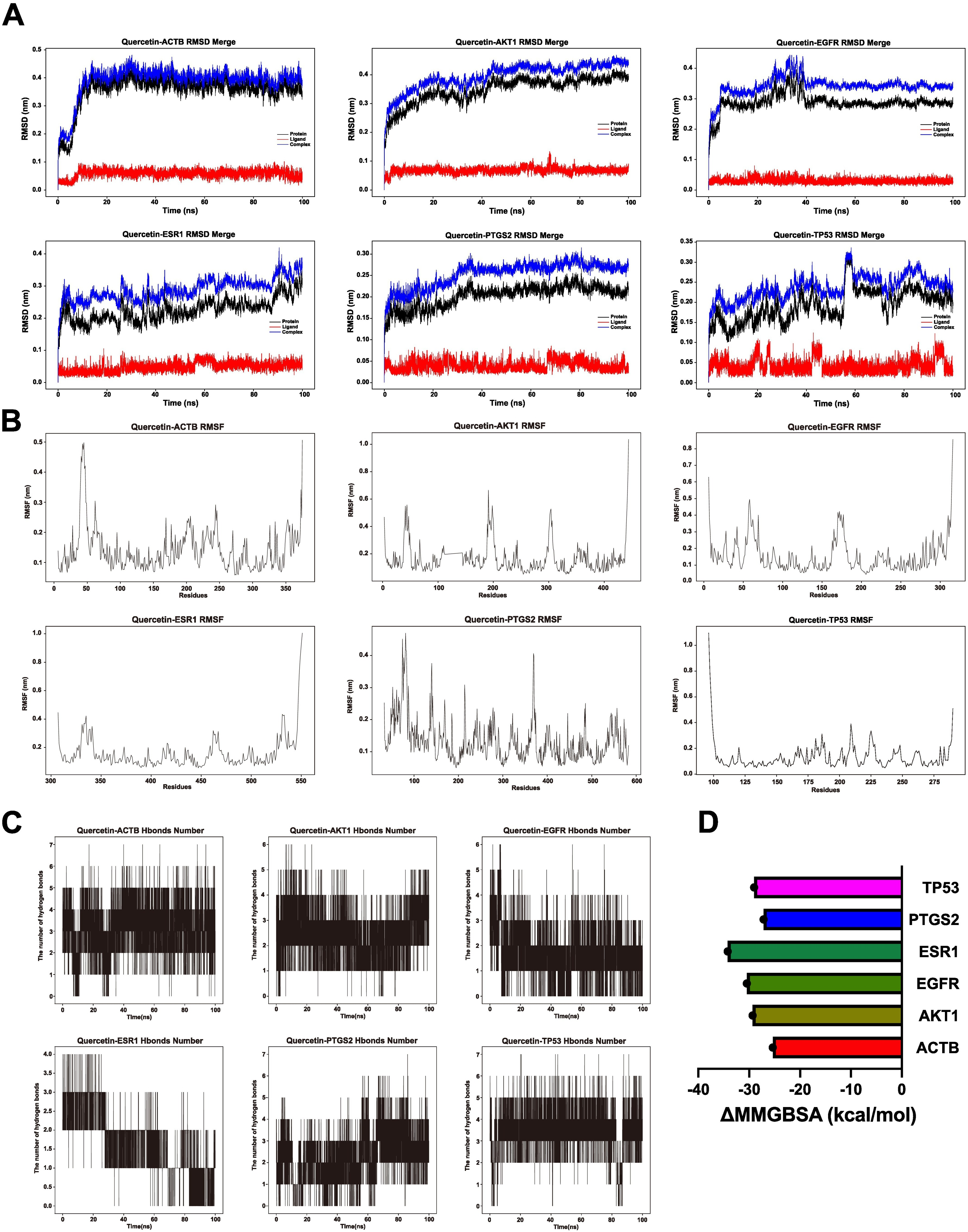 通过GROMACS进行100ns全原子MDS,分析蛋白结构灵活性和槲皮素-蛋白复合物稳定性。模拟结果显示,所有hub基因的RMSD曲线波动较小,表明结构稳定(图7A)。RMSF值反映了特定残基的柔性变化(图7B)。氢键分析显示槲皮素复合物中存在稳定的氢键(图7C)。ΔGMMGBSA值表明槲皮素-蛋白复合物的自由能较低(图7D,表S8)。Rg值显示复合物在模拟期间波动极小,分子内部相互作用稳定(图7E)。自由能景观图显示明显的能量minimum点,进一步验证了复合物的稳定性(图7F-G)。总体而言,槲皮素与所有hub基因的复合物均表现出良好的动力学特性。