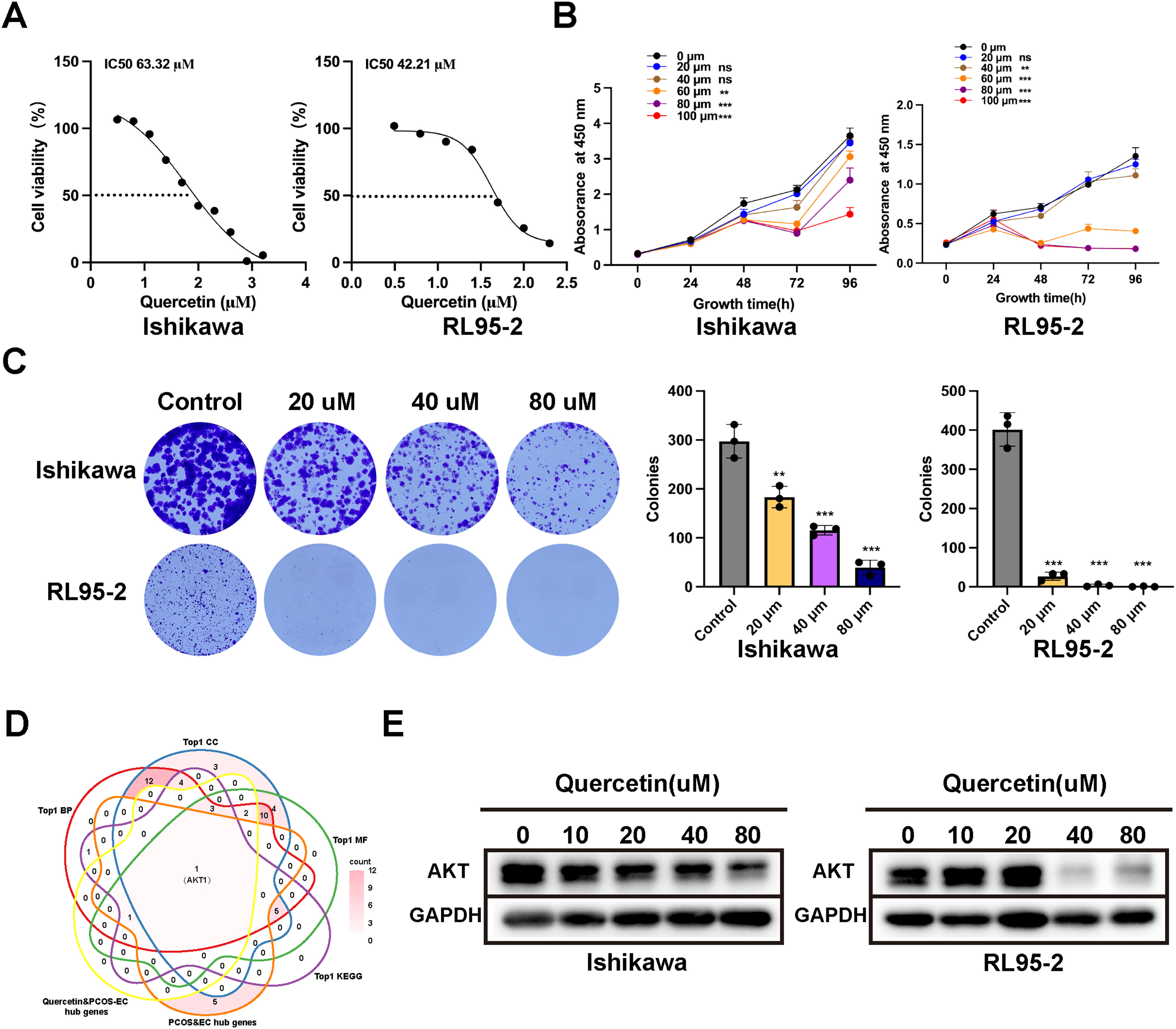 通过CCK-8实验测定槲皮素对Ishikawa和RL95-2细胞的半数抑制浓度(IC50),分别为63.32μM和42.21μM(图8A)。CCK-8增殖实验显示槲皮素以剂量依赖方式抑制两种细胞的增殖(图8B)。克隆形成实验进一步证实槲皮素显著降低EC细胞的克隆形成能力(图8C)。通过GO注释、KEGG通路与共有hub基因的交集分析,确定AKT1为only共享基因(图8D)。Western blot验证显示,槲皮素处理后EC细胞中AKT表达显著下调(图8E)。