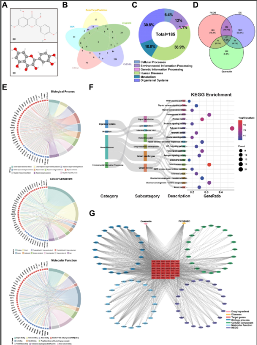 研究背景:子宫内膜癌(EC)是女性常见恶性肿瘤,多囊卵巢综合征(PCOS)是其重要风险因素。槲皮素对PCOS和EC有潜在治疗效果,但具体分子靶点不明。本研究旨在通过网络药理学、分子动力学模拟和体外实验,阐明槲皮素治疗PCOS-EC的潜力。