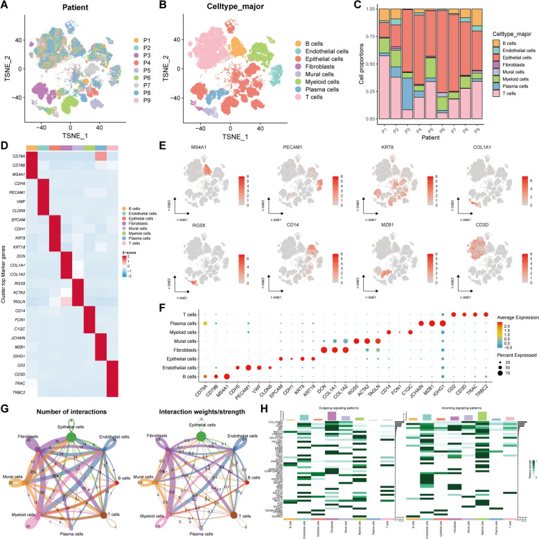 为解析未治疗三阴性乳腺癌的异质免疫微环境,收集9例患者的活检肿瘤组织进行单细胞RNA测序(图1A、B)。剔除低质量细胞后,最终获得92,304个细胞,将其分为8种主要细胞类型,即B细胞、内皮细胞、上皮细胞、成纤维细胞、壁细胞、髓系细胞、浆细胞和T细胞。基于患者标签或主要细胞类型的UMAP可视化如图2A、B所示,图2C显示了9例患者中8种主要细胞类型的比例。此外,这些主要细胞类型通过经典谱系标志物定义(图2D-F)。CellChat分析发现,成纤维细胞和髓系细胞在数量和强度上的相互作用最显著(图2G)。值得注意的是,成纤维细胞的输出信号频率highest,而髓系细胞的输入信号频率highest,表明它们在TNBC微环境中起重要作用(图2H)。总之,TNBC的异质TME基于多种细胞类型及其强烈的相互作用。