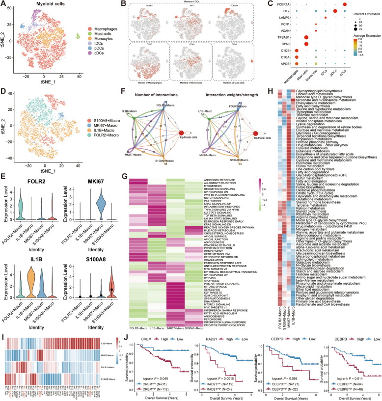基于tSNE算法,髓系细胞被重新聚类为6个亚群,即巨噬细胞、肥大细胞、单核细胞、耐受性树突状细胞(tDCs)、浆细胞样DCs(pDCs)和常规DCs(cDCs)(图3A),亚群标志物如图3B、C所示。重点研究巨噬细胞,确认了4个亚群,包括S100A8+巨噬细胞、IL1B+巨噬细胞、FOLR2+巨噬细胞和MKI67+巨噬细胞(图3D)。小提琴图显示各亚群标志物的表达水平,证实聚类准确性(图3E)。此外,CellChat分析发现巨噬细胞各亚群间存在广泛通讯(图3F)。功能富集分析显示各亚群富集不同通路(图3G)。代谢分析表明FOLR2+和MKI67+巨噬细胞代谢活性较高(图3H)。转录因子分析发现各亚群转录因子表达不同,且与不良预后相关(图3I、J)。总之,髓系细胞尤其是巨噬细胞的异质性与TNBC不良预后相关。