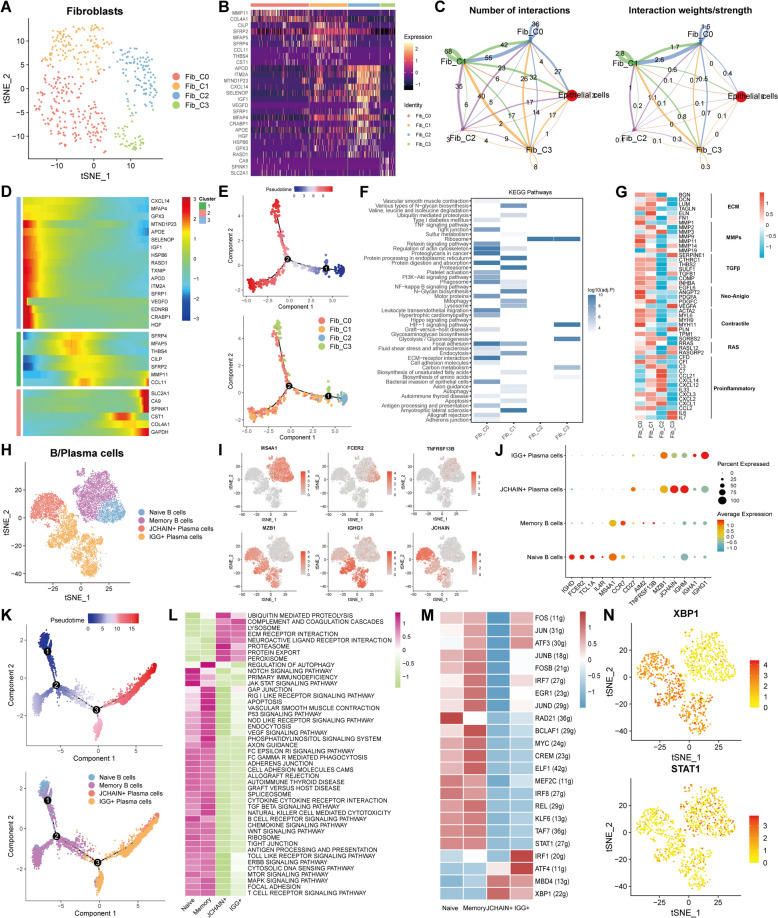 越来越多的证据表明,原发或转移性肿瘤的成纤维细胞具有显著的适应性、可塑性和韧性,通过与TME中的各种细胞群相互作用促进肿瘤进展[44]。对成纤维细胞进行重新聚类,基于tSNE算法明确了4个集群(Fib_C0-C3)(图4A)。热图显示这些集群间的差异表达基因(图4B)。CellChat分析表明Fib_C0和Fib_C1集群的通讯比Fib_C2和Fib_C3更频繁(图4C)。拟时序分析显示从Fib_C2到其他集群的分化轨迹(图4D、E)。KEGG富集分析发现Fib_C0和Fib_C1富集多种通路(图4F)。表面蛋白基因表达比较显示Fib_C0和Fib_C1与多种extracellular基质等相关基因相关(图4G)。随后,确认了2个B细胞亚群(naive和记忆B细胞)和2个浆细胞亚群(JCHAIN+和IGG+浆细胞)(图4H),各亚群标志物如图4I、J所示。Monocle分析阐明了从B细胞到浆细胞的分化过程(图4K)。通路富集分析显示naive和记忆B细胞免疫调节通路活跃,而浆细胞亚群泛素介导的蛋白水解等通路活跃(图4L)。转录因子分析显示浆细胞亚群XBP1表达升高,B细胞亚群STAT1表达升高(图4M、N)。总之,成纤维细胞和B细胞的多样性在分化轨迹等方面得到阐明。
