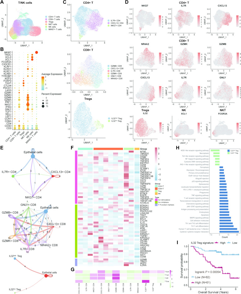 T细胞和NK细胞也是TME的重要组成部分。筛选出T/NK细胞并重新命名,鉴定出CD4+T细胞、CD8+T细胞、调节性T细胞(Tregs)、MKI67+T细胞、NK细胞和NKT细胞(图5a),各细胞类型标志物如图5B所示。CD4+T细胞、CD8+T细胞和Tregs的亚群如图5C、D所示。CellChat分析发现各亚型与上皮细胞的通讯存在差异(图5E)。免疫相关基因表达和功能评分显示各亚型存在显著差异,IL32high Treg在免疫逃逸中起重要作用(图5F、G)。通路富集分析显示IL32high Treg富集更多免疫失调相关通路(图5H)。生存分析表明IL32high Treg浸润多的患者预后差(图5I)。总之,TNBC免疫细胞异质性显著,IL32high Treg可能促进免疫逃逸。