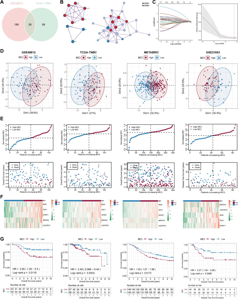 为挖掘恶性上皮细胞中差异表达标志物的临床价值,利用单变量Cox回归和LASSO算法在TNBC患者的bulk转录组数据中筛选出具有预后意义的恶性基因。训练集包括GSE58812和TCGA-TNBC数据集,验证集包括METABRIC和GSE21653数据集。通过单变量Cox回归和重叠分析,在训练集中筛选出28个共同基因(图7A、B),最终通过LASSO算法选择5个基因构建恶性细胞指数(MCI)(图7C)。PCA分析显示在训练和验证队列中基于MCI的区分效果良好(图7D)。MCI值调整后显示MCIhigh组死亡患者比例可能更高(图7E)。热图显示5个关键基因在MCIhigh患者中均上调(图7F)。Kaplan-Meier生存分析显示MCIhigh患者生存率显著降低(图7G)。总之,内部训练和外部验证表明MCI在监测TNBC患者生存结局方面具有潜力。