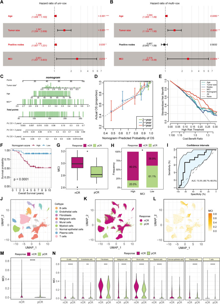 森林图显示在GSE58812队列中,MCI是独立预后指标(图8A、B)。通过多变量Cox和逐步回归分析构建列线图模型,可估计2、3和5年OS概率(图8C)。校准曲线显示预测与观察的生存率一致性良好(图8D)。决策曲线分析显示列线图性能优于其他预测因子(图8E)。列线图评分分析显示低评分患者预后更好(图8F)。为探索MCI是否与免疫治疗反应预测相关,收集接受ICB(度伐利尤单抗联合奥拉帕利)和紫杉醇治疗的TNBC患者的转录组数据。计算每位患者的MCI,结果显示对ICB无病理完全缓解(nCR)的TNBC患者MCI值高于有病理完全缓解(pCR)的患者(图8G)。基于MCI中位数分组,MCIhigh亚组nCR患者比例显著更高(图8H)。ROC分析显示AUC值为0.733(图8I)。此外,在7例接受新辅助ICB治疗的患者中验证,nCR组累积MCI更高(图8J-M)。各主要细胞类型中,除正常上皮细胞外,nCR组MCI值显著升高(图8N)。总之,这些发现表明MCI可预测TNBC患者的免疫治疗不良反应。