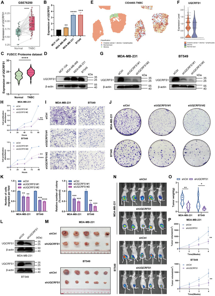 为探索UQCRFS1在TNBC中的表达和临床意义,在GSE76250数据集中比较配对的非肿瘤和TNBC样本中UQCRFS1的表达,显示TNBC组织中UQCRFS1明显升高(图9A)。qRT-PCR发现TNBC细胞系中表达高于乳腺上皮细胞系MCF-10A(图9B)。FUSCC蛋白质组数据显示UQCRFS1蛋白在TNBC组织中上调(图9C)。Westernblot分析证实TNBC细胞系中UQCRFS1蛋白水平显著升高(图9D)。收集含1例TNBC患者的空间转录组数据集,显示UQCRFS1主要在肿瘤区域表达(图9E、F)。