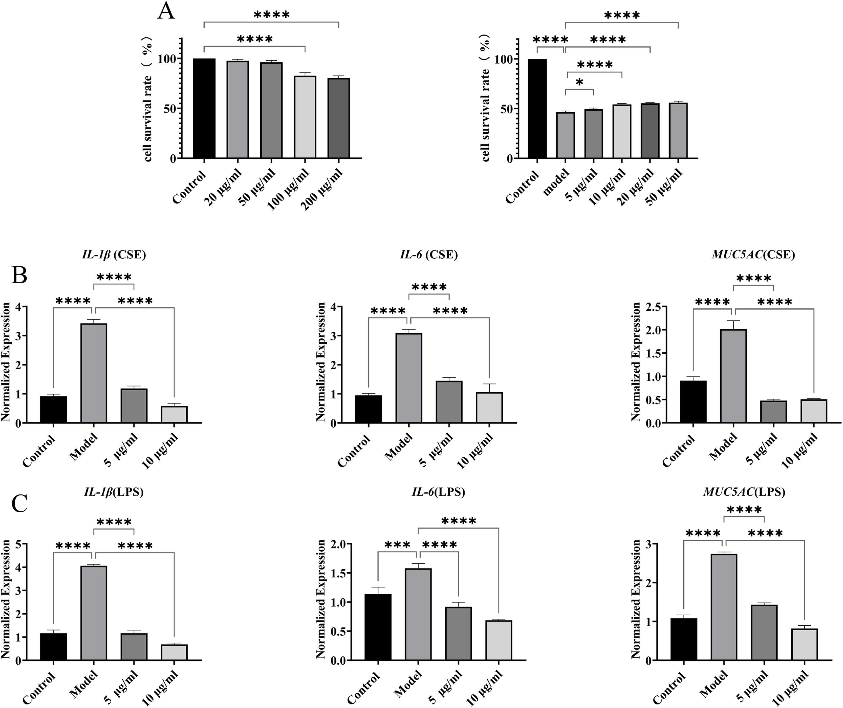 通过MTT法测定TPTF在20-100μg/ml范围内的细胞毒性。结果表明,在20-50μg/ml范围内无显著细胞毒性(图3A)。通过MTT法测定TPTF对CSE诱导的BEAS-2B细胞毒性的保护作用,5-50μg/ml的TPTF可逆转CSE诱导的细胞损伤(图3A)。此外,建立了两种细胞损伤模型以尽可能全面地模拟COPD中的上皮细胞损伤。在1%CSE刺激的BEAS-2B细胞中,IL-1β、IL-6和MUC5aC的mRNA水平显著升高,而TPTF降低了这些细胞因子的表达(图3B)。在5μg/mlLPS刺激的BEAS-2B细胞中,TPTF表现出相同的保护作用(图3C)。