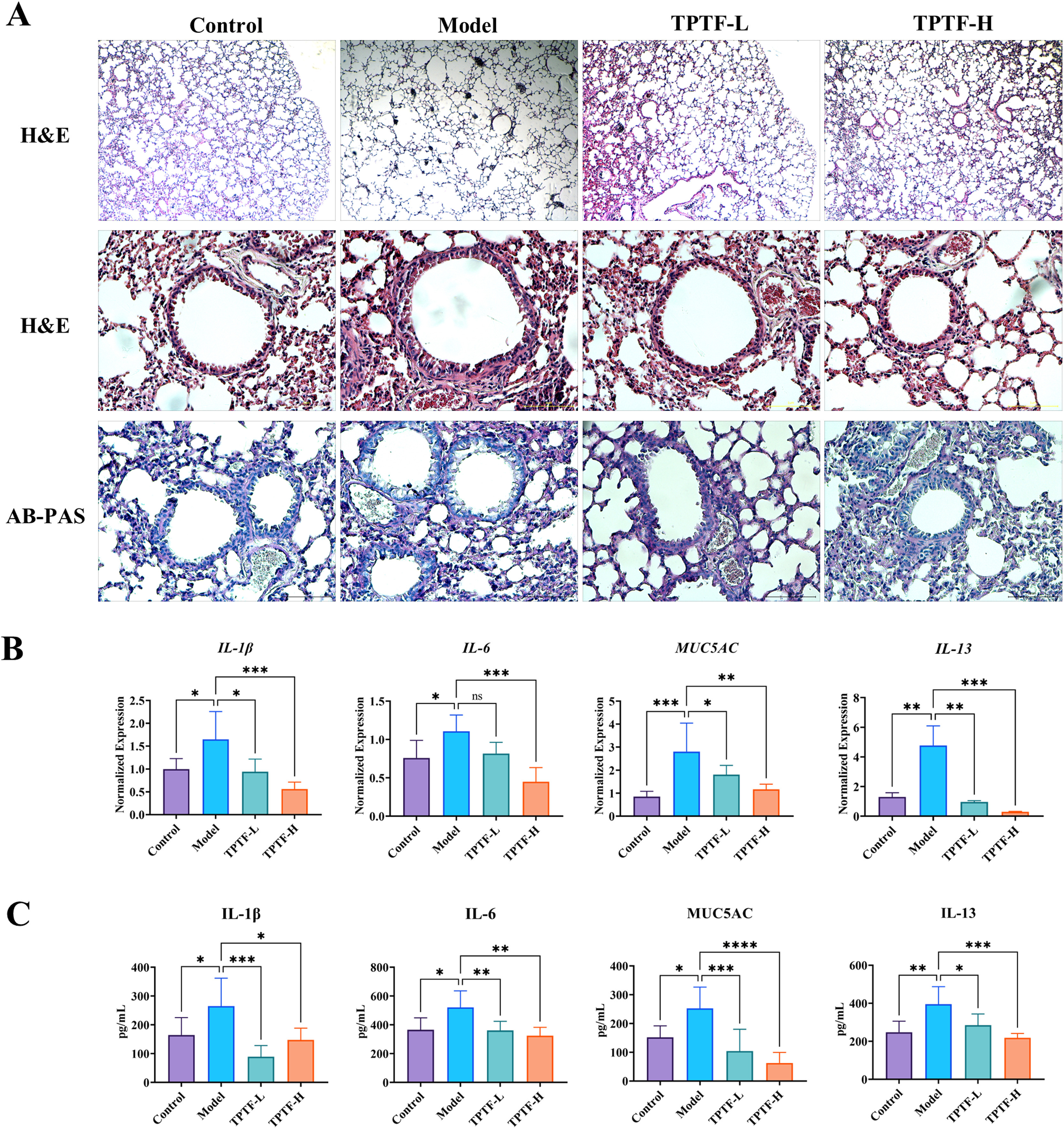 建立COPD小鼠模型后,肺组织的肺泡完整性被破坏,导致肺大疱形成(图4A)。与模型组相比,TPTF给药组(COPD+TPTF-l组和COPD+TPTF-H组)肺泡间隔破裂减少,肺泡完整性改善。与此同时,TPTF给药组还显著减轻了模型诱导的气道基底层增厚、生化杯状细胞增多和气道炎症细胞浸润(图4A)。此外,AB-PAS染色结果显示,COPD模型小鼠气道黏蛋白分泌显著增加,而TPTF给药组显著减少(图4A)。与此一致,与黏蛋白合成和分泌密切相关的MUC5aC的过表达与模型组相比也被TPTF给药抑制(图4B和C)。这些结果表明,TPTF可以抑制COPD小鼠的肺损伤和黏液分泌。