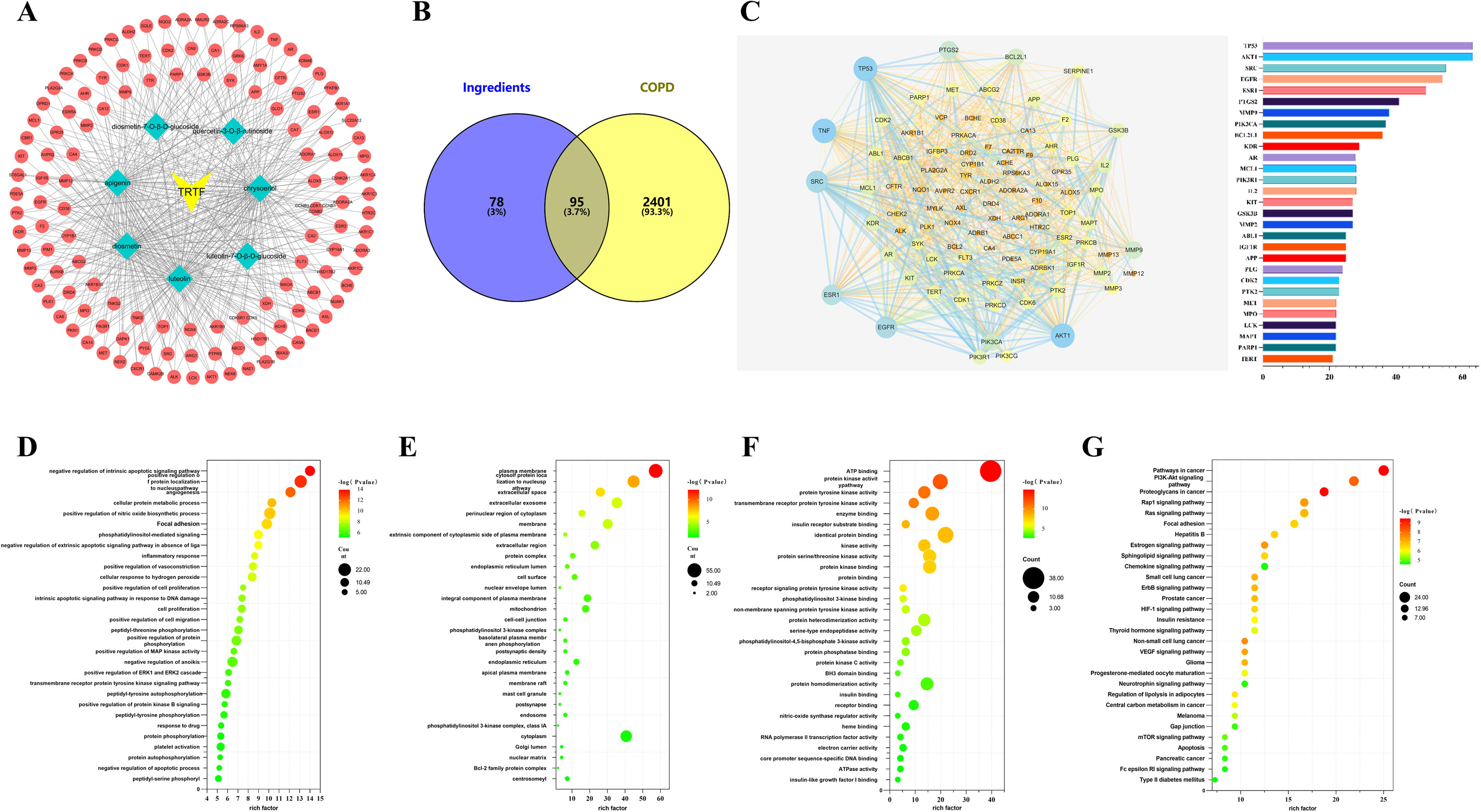 利用SwissTargetPrediction平台预测TPTF的靶点。对数据进行系统汇总和去重后,共得到173个靶点(图5a)。在数据库中搜索与COPD相关的靶点。合并数据并去除重复和低分值后,建立了2427个COPD靶点数据库。两个靶点数据库的交集显示95个潜在治疗靶点(图5B)。将95个潜在靶点上传至STRING11.0数据库构建PPI网络(图5C),然后使用Cytoscape软件重建。在该网络中,节点大小对应度值,表明每个靶点的重要性。确定的十个最突出的节点(TNF、TP53、AKT1、SRC、EGFR、ESR1、PTGS2、MMP9、PIK3CA和BCL2L1)被归类为主要治疗靶点(图5C)。GO富集和KEGG通路分析:利用DAVID平台进行GO富集和KEGG通路分析。生物过程(BP)、分子功能(MF)和细胞组分(CC)的前30个术语分别在不同图中呈现(图5D、5E、5F)。此外,靶点在KEGG分析中的前30个信号通路的详细信息如图所示(图5G)。主要通路包括癌症通路(hsa05200)、PI3K-Akt信号通路(hsa04151)、非小细胞肺癌(hsa05223)、VEGF信号通路(hsa04370)和小细胞肺癌(hsa05222)(图5E)。