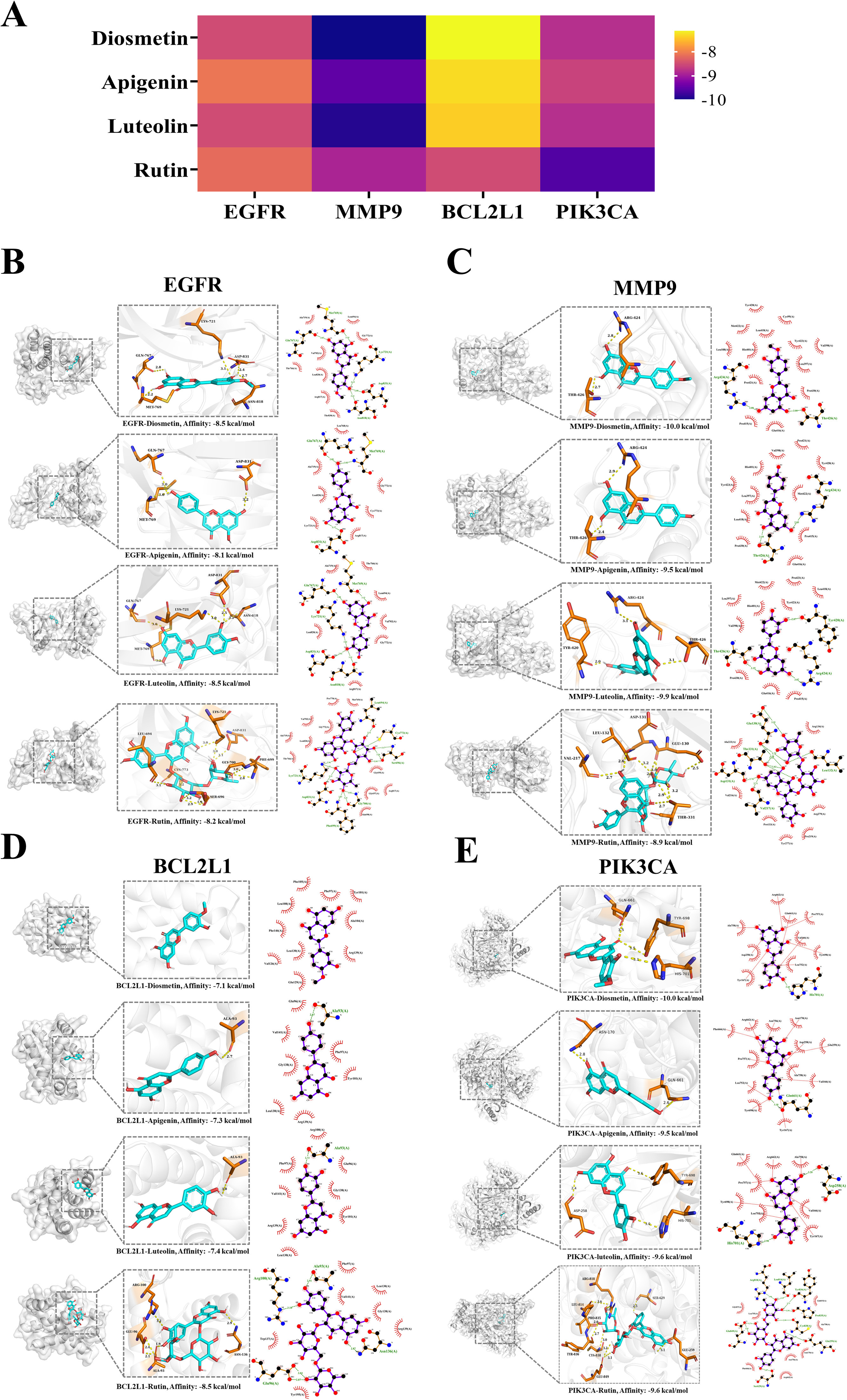 基于瓜蒌血清化学成分的定性分析和TPTF的定性分析,关键成分为槲皮素、Diosmetin、山奈酚、芹菜素及其糖苷。此外,关键靶点为EGFR、MMP9、BCL2L1和PIK3CA。使用AutoDockTools对它们进行分子对接研究,获得16个对接结果(图6A)。结合能越低,表明该成分与靶点的亲和力越强。所有组的结合能均小于-7.1(详细数据见图6),表明成分之间的结合可以自发发生。因此,使用PYMOL软件将16种对接模式可视化,如图6B、6C、6D和6E所示。