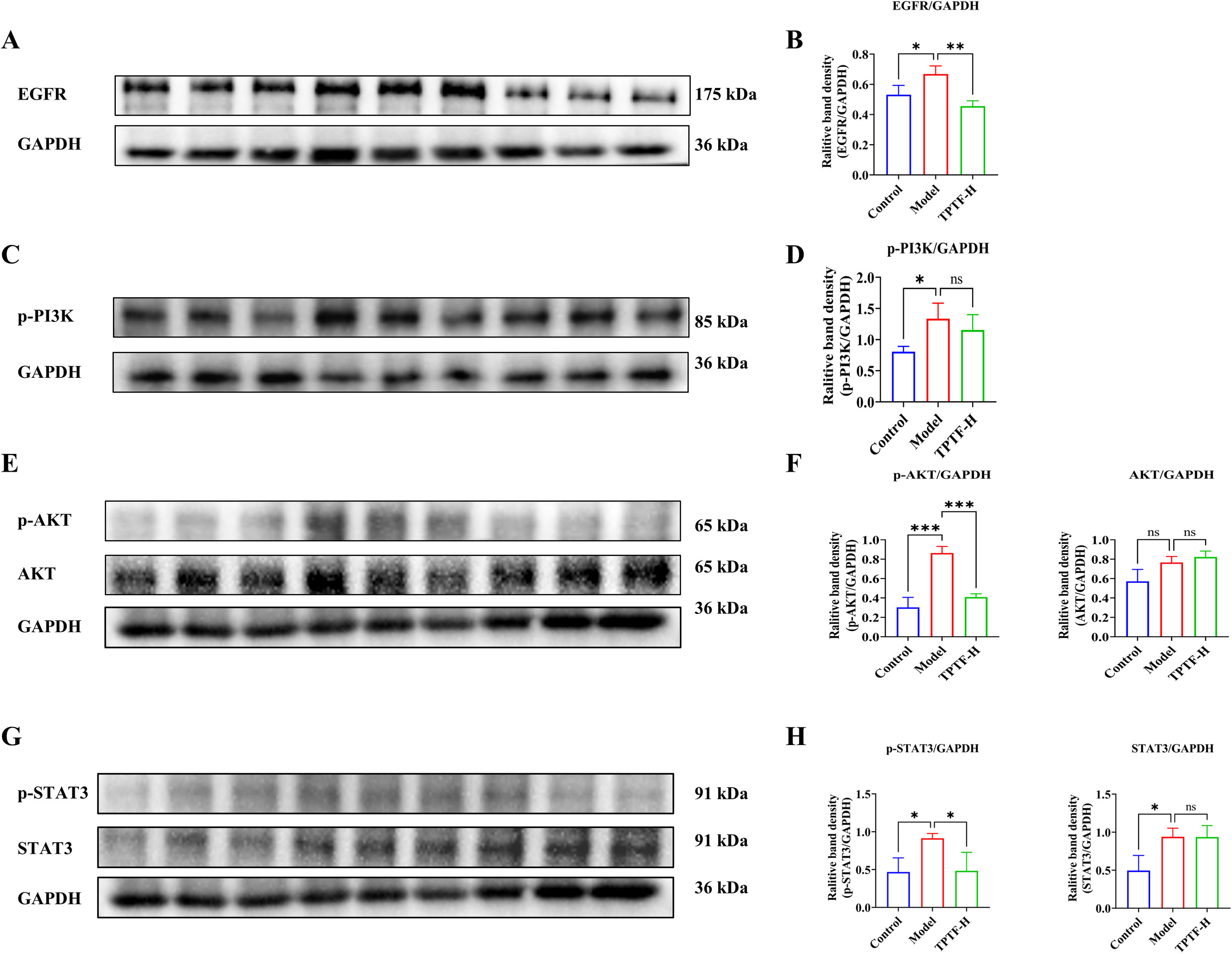 TPTF对EGFR信号通路的影响:网络药理学研究揭示了表皮生长因子受体(EGFR)这一PI3K/AKT(磷脂酰肌醇-3-激酶/蛋白激酶B)信号通路上游靶点的重要发现。结果验证表明,CSE确实导致肺组织中EGFR显著增加。相反,TPTF显著降低了EGFR的表达水平(图7A和7B)。此外,CSE可显著升高小鼠肺中PI3K和AKT的磷酸化水平,而TPTF逆转了AKT的磷酸化水平,并具有降低PI3K磷酸化的趋势(图7C、7D、7E和7F)。此外,由于CES,IL-13的表达升高,以及嗜酸性粒细胞趋化因子(Eotaxin,IL-13的下游效应物,详细信息见图S2),这会导致气道嗜酸性粒细胞浸润并诱导呼吸道炎症(Berkman,2001)。STAT3是一种重要的炎症调节因子,不仅是EGFR、IL-6和IL-13的重要下游信号分子,还调节IL-13的表达。为了评估TPTF对STAT3的潜在影响,我们分析了STAT3的表达和磷酸化水平,发现CSE可显著增加磷酸化STAT3和STAT3的水平。相反,TPTF显著降低了p-STAT3的表达(图7G和图7H)。因此,TPTF似乎通过抑制EGFR/STAT3信号通路来减轻炎症和肺损伤。