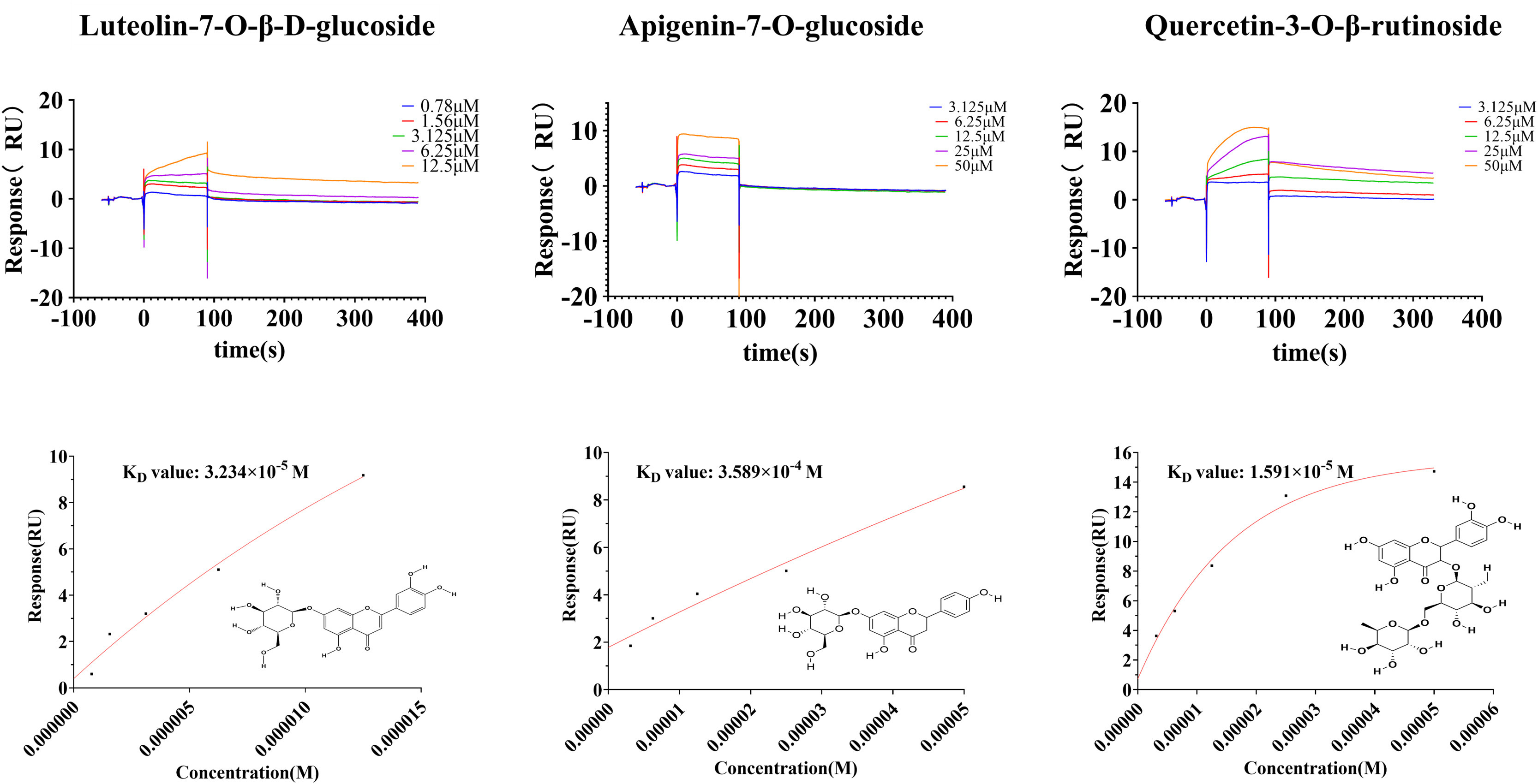为了研究哪些物质可以特异性结合EGFR受体并下调EGFR表达,我们采用SPR技术评估物质与EGFR的亲和力。SPR提供高精度、实时和无标记的测量,是评估分子相互作用的强大工具。九种小分子(槲皮素、Diosmetin、山奈酚、芹菜素、及其糖苷等)在不同梯度浓度(25、12.5、6.25、3.125、1.25μM)下与芯片上的EGFR进行测试,测量并拟合结合能和KD值。在测试的九个小分子中,三个分子与EGFR表现出快速结合和快速解离模式(图8)。它们的KD值分别为1.591×10⁻⁵M、3.589×10⁻⁵M和3.234×10⁻⁵M,表明这些化合物可以明确结合EGFR。槲皮素-3-O-β-芸香糖苷与EGFR的结合能力优于槲皮素,芹菜素-7-O-葡萄糖苷优于芹菜素,木犀草素-7-O-β-D-葡萄糖苷优于木犀草素,它们都是一对黄酮苷及其苷元,这说明黄酮苷在结合亲和力方面优于苷元。
