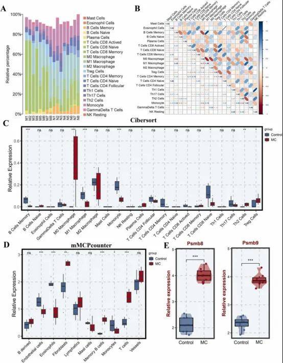 使用CIBERSORTx算法探索对照组和MC组间21个免疫细胞亚群的免疫浸润。图3A显示每个样本中免疫细胞的相对比例。21种免疫细胞间相关性的热图如图3B所示。根据图3C,被认为是促炎的M0巨噬细胞、浆细胞、Th2细胞和Treg细胞在MC组显著更丰富。此外,进行mMCPcounter以说明对照组和MC样本间的免疫浸润(图3D)。此外,发现一些经典免疫相关基因如Psmb8和Psmb9在MC组显著上调,这进一步证明炎症应激在MC介导的肾损伤中起不可忽视的作用(图3E)。