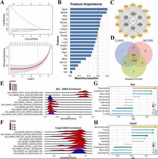 为进一步理解MC诱导肾损伤的生物学过程,使用LASSO回归、RF和MCODE算法鉴定在MC肾毒性网络中起关键作用的枢纽基因(图5a-C)。通过重叠三种ML算法鉴定的基因,选择两个与MC诱导肾损伤相关的关键基因:Ren和Casp3(图5D)。Ren主要富集于能量代谢和炎症反应相关通路,而Casp3主要富集于细胞生长、增殖、存活和免疫防御及炎症调控相关通路(图5E和5F)。此外,Ren与嗜酸性粒细胞、内皮细胞、肥大细胞、巨噬细胞和活化T细胞显著正相关,而Casp3与活化B细胞、调节性T细胞、成纤维细胞、淋巴管和M0巨噬细胞显著正相关(图5G-H)。