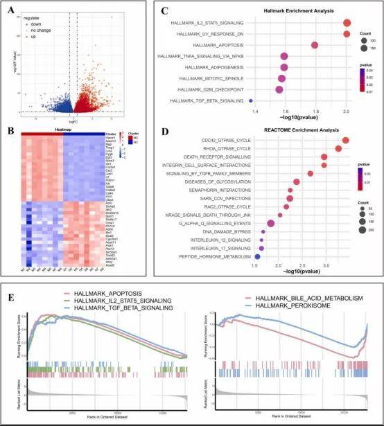 为探索MC诱导肾损伤的潜在机制,对MC组肾组织进行RNA-seq(图2A)。创建热图以可视化MC组中20个最显著上调和下调的基因(图2B)。进行GO和KEGG富集分析以阐明与DEGs相关的生物学过程和通路。此外,Hallmark通路富集分析显示DEGs主要富集于免疫调节、细胞周期调控、凋亡、炎症反应、分化及细胞组织发育(图2C)。Reactome通路富集分析表明DEGs显著富集于细胞增殖、分化和凋亡调控、免疫反应、DNA损伤反应和内分泌激素合成(图2D)。此外,进行GSEA以鉴定DEGs中显著富集的基因集(图2E)。BILE_ACID_METABOLISM和PEROXISOME通路下调(图2F)可能与细胞代谢紊乱和内分泌失调相关。