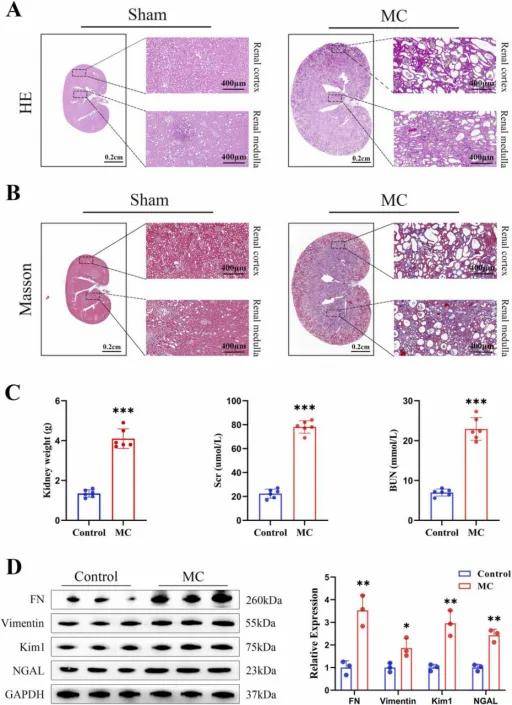 组织病理学分析肾脏损伤显著(图1A和1B)。进一步分析肾脏重量及Scr和BUN水平显示,与对照组相比,MC组显著增加,表明代偿性肾肥大和肾功能受损(图1C)。WB分析结果显示MC组中肾损伤和纤维化的关键标志物,包括FN、波形蛋白、Kim-1、NGAL、Clu、Tff3和Opn显著上调(图1D)。这些发现共同表明MC暴露可诱导严重的肾损伤和纤维化。