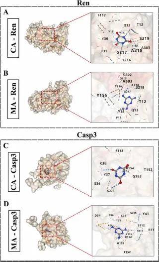 为预测抗MC介导肾损伤的潜在药物靶点,分别对Ren和Casp3与MA和CA进行分子对接模拟。获得四组药物-靶点相互作用:CA-Ren、MA-Ren、CA-Casp3和MA-Casp3。如图7A所示,Ren的氨基酸残基G217、A218、S219、Q13、Y155、Y14、Y15、F117、V30、F31、T216和A303主要结合并与CA相互作用。类似地,Ren的A303、T216、G217、A218、S219、T12、Q13、V30、Y14、Y155、G302和Y15是与MA相互作用的活性位点(图7B)。对于Casp3,Casp3的氨基酸残基K154、P155、K271、Y37、S112、K38、S36、G153和T152主要结合并与CA相互作用,而MA主要作用于Casp3的K271、G153、S113、S112、P155、K154、D34、S36、K38、M39、Y41和R11、T152活性位点(图7C和7D)。这些发现表明MC可与上述靶蛋白结合并导致肾损伤。然而,需要进一步的实验验证来确认这些相互作用及其生物学意义。